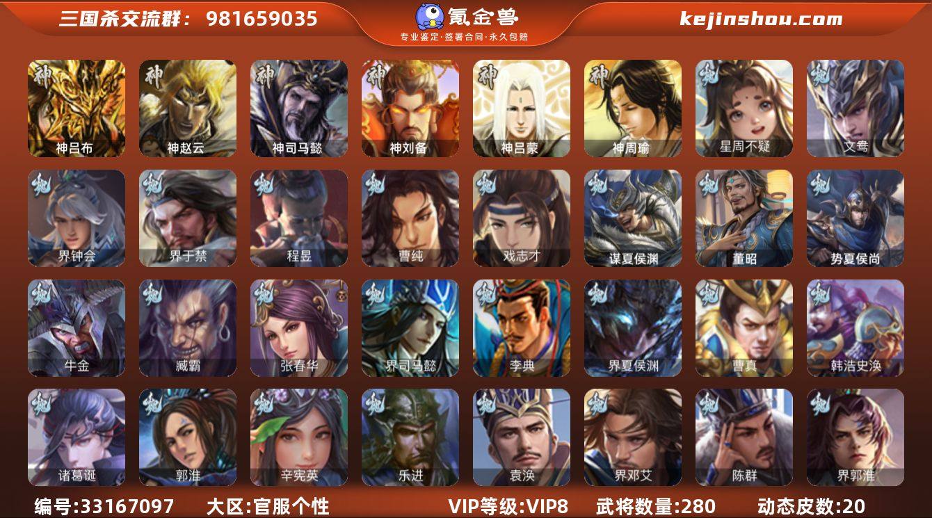 官阶:骠骑将军;VIP等级:VIP8;史诗武将数量:24;动态皮肤数量:20;武将总数:280;史诗宝珠数量:14;将魂数量:4014;神将:4;魏国史诗武将:8;蜀国史诗武将:4;吴国史诗武将:3;群史诗武将:9