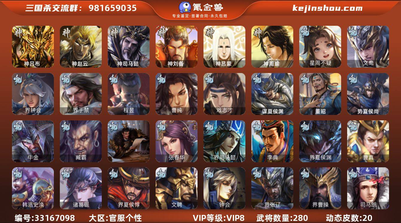 【JYSGS2】官阶:骠骑将军;VIP等级:VIP8;史诗武将数量:24;动态皮肤数量:20;武将总数:280;史诗宝珠数量:14;将魂数量:4014;神将:4;魏国史诗武将:8;蜀国史诗武将:4;吴国史诗武将:3;群史诗武将:9 神吕布,神赵云,神司马懿,神刘备,星周不疑,界钟会,界于禁,曹纯,戏志才,程昱,谋赵云,谋马超,沙摩柯,谯周,界徐盛,文鸯,星黄忠,麹义,界左慈,公孙康,谋张角,星董卓,兀突骨,司马昭,神吕蒙,神周瑜,势夏侯尚,SP关羽,SP蔡文姬,乐进,曹昂,诸葛诞,朱灵,文聘,SP姜维,张春华,钟会,曹冲,郭淮,满宠,界王异,界曹操,界司马懿,界夏侯惇,界张辽,界许褚,李典,曹真,韩浩史涣,陈群,钟繇,司马朗,辛宪英,鲁芝,蒯越蒯良,界荀彧,界邓艾,界郭淮,卞夫人,蔡贞姬,袁涣,崔琰,谋夏侯渊,牛金,界夏侯渊,臧霸,董昭,势陈到,SP孙尚香,夏侯霸,马良,关兴张苞,廖化,界马岱,关平,简雍,刘封,界法正,界关兴张苞,界刘备,界张飞,界马超,SP徐庶,吴懿,周仓,张松,刘谌,马忠,孙乾,李严,黄皓,赵统赵广,严颜,界伊籍,界庞统,界孟获,界祝融,陈到,界姜维,张翼,杨仪,邓芝,陈震,向宠,彭羕,谋庞统,谋张飞,霍峻,诸葛果,甘夫人,势陈祗,鲁肃,孙茹,凌操,诸葛恪,诸葛瑾,孙鲁育,程普,韩当,潘璋马忠,虞翻,朱然,界甘宁,界吕蒙,界黄盖,界周瑜,界...
