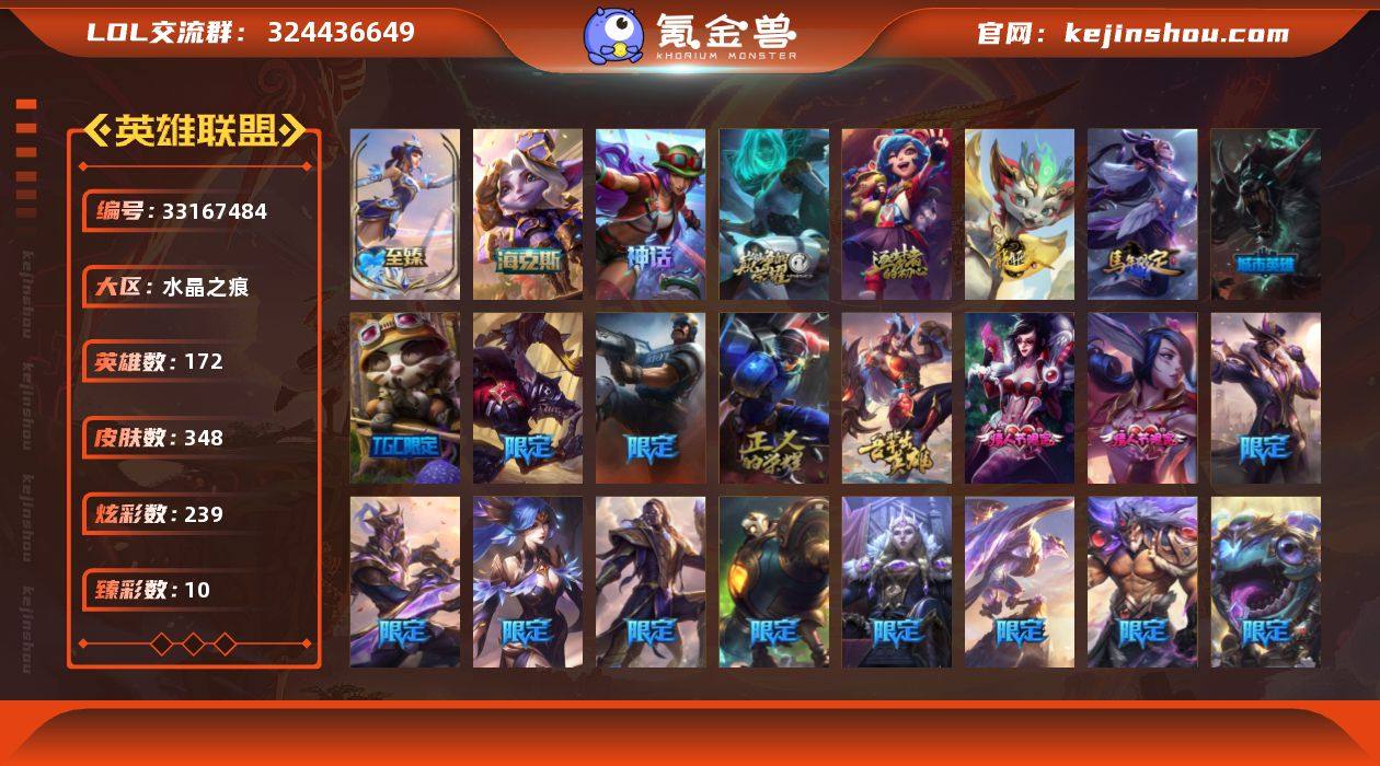 【LDC3202】172英雄/348皮肤/6神话/39限定/10臻彩/239炫彩/20传说/67史诗/铂金/10周年 安妮/源代码 乐芙兰/十五周年纪念 希维尔/10周年庆典 凤凰/至臻 青花瓷 拉克丝/海克斯 崔丝塔娜/天龙之子 卡莎 飞龙乘云/霸天异形 卡兹克 掠空魅影/星之守护者 娑娜 未来之光/星之守护者 卡莎 热情之光/灵魂莲华 亚索 霜见之时/星之守护者 阿卡丽 热情之光/魔女 阿卡丽 虚荣/净雪之月 莫甘娜 冬虹/广寒仙子 嫦娥/天龙之子 斯莫德/龙马烈焰波比/甜心之羽 霞/觅心猎手 薇恩/幸福女神 乐芙兰/圣诞精灵 崔丝塔娜/圣诞糖果棒 厄运小姐/胡桃夹子 小丑/雪默丁格/S2 暗杀星 伊泽瑞尔/S3 SKT T1 贾克斯/S4 SSW 炼金/S4 SSW 图奇/S5 SKT T1 阿利斯塔/S8 IG 卡莎/S8 IG 洛/S9 FPX 墨菲特/暗裔英雄 盖伦/胜利枪神 卢锡安/胜利机器人 布里茨/胜利女神 瑟庄妮/胜利凤凰 艾尼维亚/胜利之王 泰达米尔/胜利巨口 克格莫/胜利女神 娑娜/胜利剑圣 易/胜利之运 崔斯特/胜利女神-菲奥娜/南瓜头 费德提克/死亡誓约 劫/泳池派对 塔莉垭/密林猎手 提莫/暗影 沃里克/都铎王朝 图奇/玉剑传说 舞龙卫/防暴士兵 格雷福斯/防暴天使 凯尔/地狱之门卫士 加里奥/血石领主 弗拉基米尔/战场女武神 凯尔/钢铁之翼 凯尔/日蚀骑士...