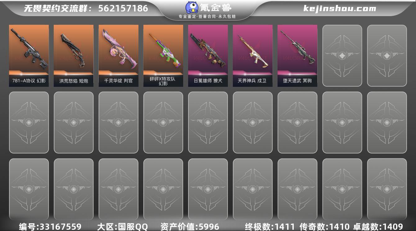 【sf144】【英雄】:炼狱,暮蝶,壹决,捷风,幽影,不死鸟,贤者,猎枭,芮娜,尚勃勒,夜露,海神,盖可,钢锁 【近战武器】:近战武器-碎心裂刃,近战武器-ORA x 颗秒 军刀 【狂徒】:狂徒-塑水宗 【幻影】:幻影-砰砰X特攻队,幻影-781-A协议 【戍卫】:戍卫-天界神兵 【獠犬】:獠犬-日冕雄师 【冥驹】:冥驹-堕天遗武 【判官】:判官-千灵华绽 【VCT手枪】:标配-VCT26 x WOL 【鬼魅】:鬼魅-千灵华绽//2.0 【短炮】:短炮-洪荒怒焰 【卡面】:树懒大作战 卡面,无畏契约GO!第一卷:芮娜 卡面,无畏契约GO!第一卷:零 卡面,无垠星环 卡面,《双城之战》金克丝 卡面,代号红色 卡面,新兵报到 卡面,V契约 卡面,无畏契约 卡面 【喷漆】:买装还是存钱 喷漆,放下武器 喷漆,胜利属于无畏契约 喷漆,GLHF 喷漆,无畏契约 喷漆 【挂饰】:动力机箱 挂饰,天外飞客 挂饰,无畏契约 纪念币 挂饰