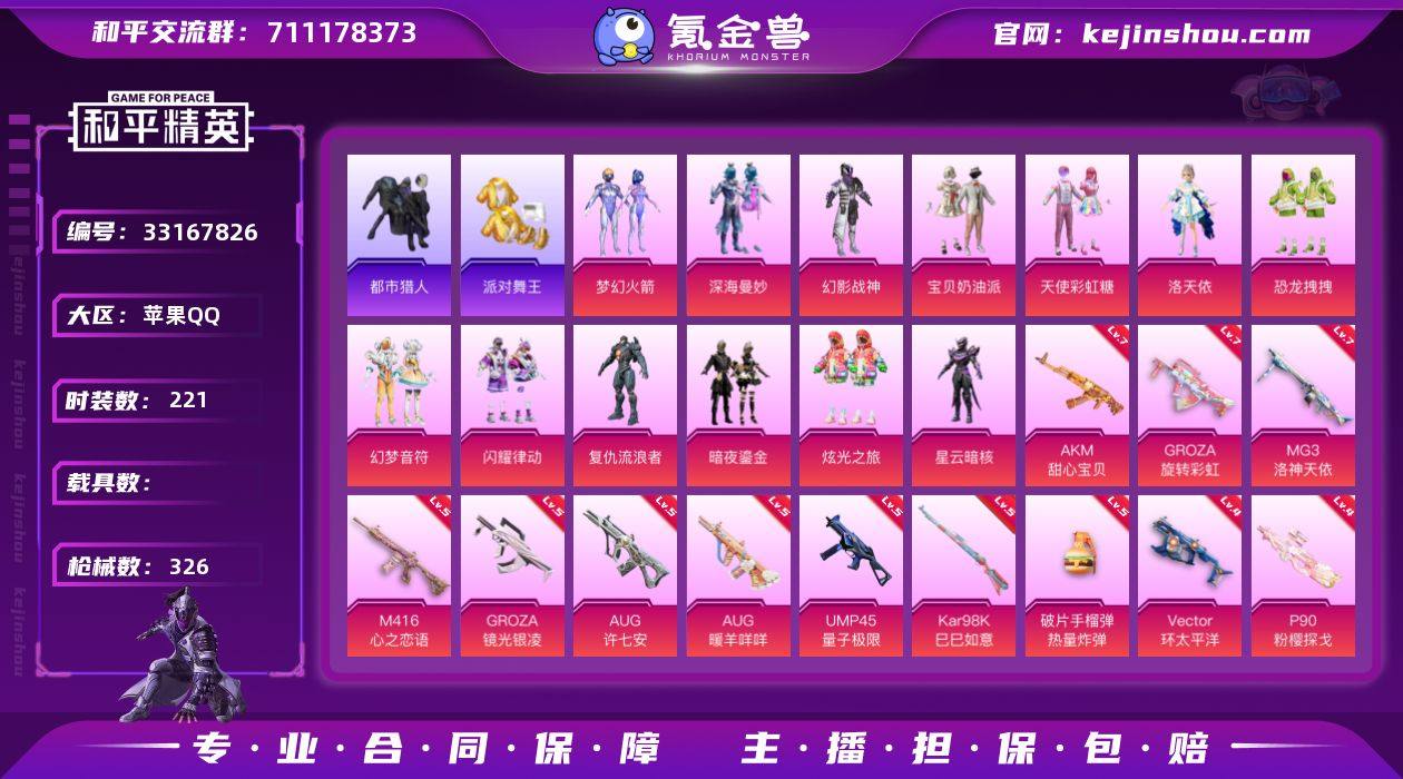苹果 手Q-1神装-13粉装-26特效枪-0载具-10粉色飞行器-111873热力值-16王牌印记-221套装-326枪皮 【红色神装等级】:暮色玫影-艾丽娅(一级) 【红色角色神装】:暮色玫影-艾丽娅 【热门品类】:粉装-梦幻火箭,套装-都市猎人,套装-派对舞王,套装-小丑鱼,角色-军刀雅典娜,套装-忍者信条,套装-龟仙人,角色-8号机,角色-Mark.06 【粉色套装】:粉装-深海曼妙,粉装-幻影战神,粉装-宝贝奶油派,粉装-天使彩虹糖,粉装-梦幻火箭,角色-洛天依,粉装-恐龙拽拽,粉装-幻梦音符,粉装-闪耀律动,角色-复仇流浪者,粉装-暗夜鎏金,粉装-炫光之旅,角色-星云暗核 【粉色枪皮等级】:AKM-甜心宝贝(七级),AKM-梦之光华(二级),AKM-星际浪客(二级),AKM-暮色玫影(三级),M416-心之恋语(五级),GROZA-旋转彩虹(七级),GROZA-镜光银凌(五级),AUG-许七安(五级),AUG-暖羊咩咩(五级),AUG-圣斗士星矢(一级),ACE32-萌骑漫游(三级),UMP45-量子极限(五级),Vector-环太平洋(四级),AKS-74U-森灵之息(五级),P90-粉樱探戈(四级),P90-沙丘之主(三级),Kar98K-巳巳如意(五级),Mk14-精灵梦叶罗丽(四级),Mk14-福马献瑞(一级),DP-28-豹影疾电(三级),MG3-洛神天依(七级),MG3-突变脉冲(一级...