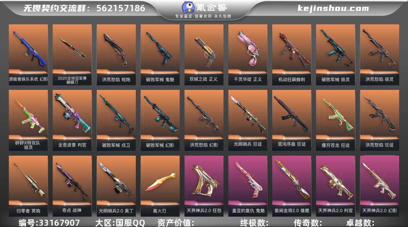 【套装】:离火刃套装,2025全球冠军赛套装,离火刃套装,《英雄联盟:双城之战》套装,洪荒怒焰套装,破败军械套装,天界神兵//2.0套装,无畏启程套装 【英雄】:幻棱,炼狱,维斯,暮蝶,钛狐,壹决,铁臂,捷风,雷兹,幽影,不死鸟,贤者,猎枭,蝰蛇,零,芮娜,奇乐,尚勃勒,霓虹,斯凯,夜露,星礈,K/O,海神,盖可,黑梦,钢锁 【近战武器】:近战武器-2025全球冠军赛 蝴蝶刀,近战武器-剥皮小刀,近战武器-紫金爪刀,近战武器-离火刃,近战武器-威龙之刃,近战武器-珍珠棘贝 短剑,近战武器-流星兵团 短剑,近战武器-超限闪存 匕首,近战武器-洪荒双斩,近战武器-破败王者之残刃,近战武器-沙尘幻旅 匕首,近战武器-神罚 军刀,近战武器-天玄刀,近战武器-天御刀,近战武器-星际猎兵 短剑 【狂徒】:狂徒-2025全球冠军赛,狂徒-光明哨兵,狂徒-洪荒怒焰,狂徒-混沌序曲,狂徒-偃月苍龙,狂徒-盖亚的复仇,狂徒-海洋之星,狂徒-耀鳞威龙,狂徒-紫阙金琅,狂徒-钢轨卫士,狂徒-弧光异彩,狂徒-流星兵团,狂徒-沙尘幻旅 【幻影】:幻影-洪荒怒焰,幻影-破败军械,幻影-末日泡泡,幻影-源能者娱乐系统,幻影-天界神兵//2.0,幻影-超限闪存,幻影-合金战车,幻影-珍珠棘...
