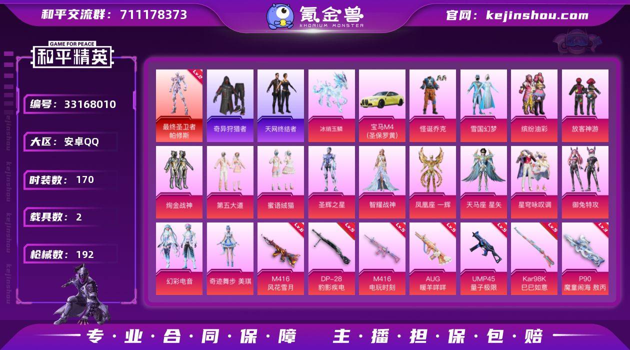【950357】安卓 手Q-无敌战神框-1神装-15粉装-9特效枪-2载具-7粉色飞行器-66957热力值-6王牌印记-170套装-192枪皮HZ262610 【红色神装等级】:最终圣卫者-帕修斯(二级) 【红色角色神装】:最终圣卫者-帕修斯 【热门品类】:粉装-怪诞乔克,粉装-雪国幻梦,粉装-缤纷油彩,套装-浪漫天命,套装-奇异狩猎者,套装-天网终结者,套装-星河浪客,套装-龟仙人,套装-暗影哥特,套装-粉红小猪,角色-8号机,角色-Mark.06 【粉色套装】:粉装-怪诞乔克,粉装-雪国幻梦,粉装-缤纷油彩,粉装-放客神游,粉装-绚金战神,粉装-第五大道,粉装-蜜语绒猫,角色-圣辉之星,角色-智耀战神,角色-凤凰座 一辉,角色-天马座 星矢,粉装-星穹咏叹调,粉装-御兔特攻,粉装-幻彩电音,角色-奇迹舞步 美琪 【粉色枪皮等级】:M416-风花雪月(六级),M416-电玩时刻(五级),AUG-暖羊咩咩(五级),UMP45-量子极限(五级),Vector-最终圣卫者(三级),P90-魔童闹海 敖丙(三级),Kar98K-巳巳如意(五级),DP-28-豹影疾电(五级),MG-36-幻彩电音(二级) 【粉色载具】:宝马M4(圣保罗黄),冰绡玉鳞 【粉色枪皮】:M416-风花雪月,M416-电玩时刻,AUG-暖羊咩咩,UMP45-量子极限,Vector-最终圣卫者,P90-魔童闹...
