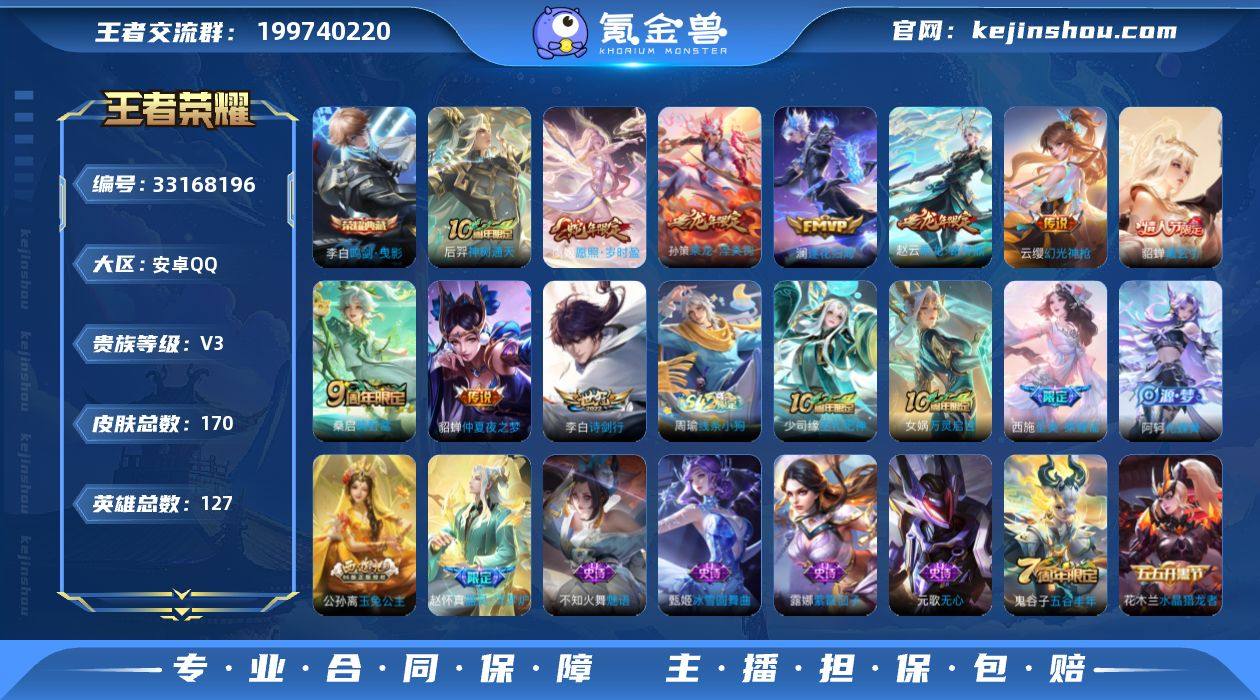 【950407】有二次安卓Q-V3-永恒钻石V段位-127英雄-170皮肤-1典藏皮肤-10传说-57史诗TD26020105 【荣耀典藏】:李白鸣剑曳影 【传说皮肤】:后羿神树通天,虞姬愿照岁时盈,云缨幻光神枪,桑启鸣野蒿,貂蝉曦玄引,孙策乘龙淬吴钩,赵云乘龙铭钟鼎,澜逐花归海,李白诗剑行,貂蝉仲夏夜之梦 【限定皮肤】:蒙犽顽岩魄,姜子牙天穹之誓,狄仁杰阴阳师,赵云皇家上将,嬴政优雅恋人,孙尚香蔷薇恋人,鲁班七号狮舞东方,元歌无心,狄仁杰魔术师,项羽海滩派对,李元芳云中旅人,鬼谷子五谷丰年,百里玄策原初追逐者,公孙离玉兔公主,沈梦溪大漠名商,沈梦溪匿光破解者,裴擒虎擒涛扼浪,云中君纤云弄巧,上官婉儿梁祝,嫦娥拒霜思,嫦娥暖冬兔眠,西施至美乘鲤谣,鲁班大师探海日志,桑启海盐诗旅,暃星界游侠,阿古朵江河有灵,张良古海寻踪,蒙犽百解令,高渐离燃音魔法,妲己灵卜魔法,鬼谷子天穹祈灯,孙策乘龙淬吴钩,赵云乘龙铭钟鼎,貂蝉曦玄引,沈梦溪龙舞盛年,刘邦剑破天穹,程咬金群星魔术团,镜青焰无极,项羽苍威无极,芈月浮光幕影,周瑜熔金海岸 【年限皮肤】:孙策乘龙淬吴钩,赵云乘龙铭钟鼎,虞姬愿照岁时盈 【赛季限定】:沈梦溪大漠名商,李元芳云中旅人,...