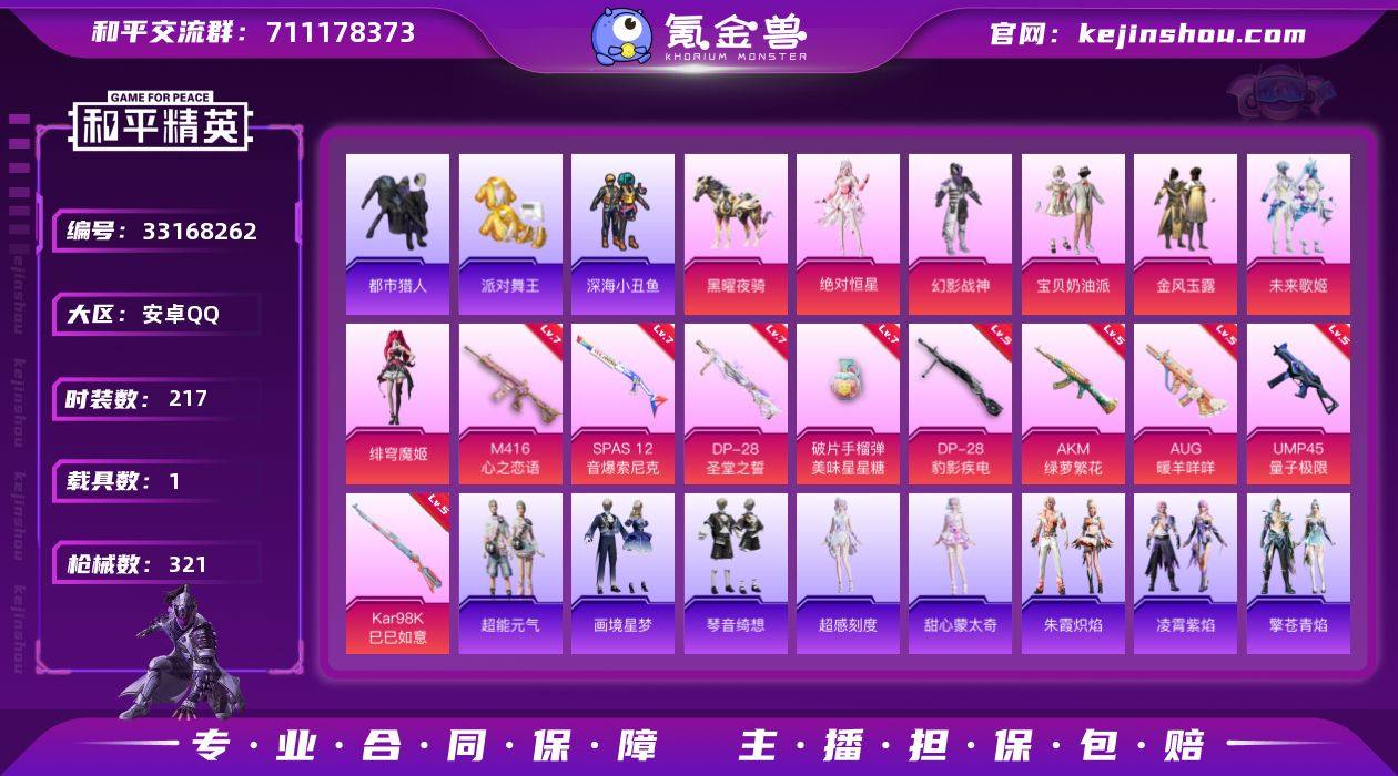 【kyhp1598】安卓 手Q-8粉装-12特效枪-1载具-3粉色飞行器-90097热力值-17王牌印记-217套装-321枪皮 【热门品类】:套装-浪漫天命,套装-都市猎人,套装-派对舞王,套装-深海小丑鱼,套装-小丑鱼,套装-龟仙人,套装-暗影哥特,角色-Mark.06,熔岩游骑兵连帽夹克 【粉色套装】:角色-绝对恒星,粉装-幻影战神,粉装-宝贝奶油派,粉装-金风玉露,粉装-未来歌姬,角色-绯穹魔姬,角色-罪夜之冕,角色-月中灵 【粉色枪皮等级】:AKM-绿萝繁花(五级),M416-心之恋语(七级),AUG-暖羊咩咩(五级),ACE32-萌骑漫游(五级),UMP45-量子极限(五级),AKS-74U-森灵之息(五级),Kar98K-巳巳如意(五级),Mk14-福马献瑞(三级),SPAS-12-音爆索尼克(七级),DP-28-圣堂之誓(七级),DP-28-豹影疾电(五级),破片手榴弹-美味星星糖(七级) 【粉色载具】:黑曜夜骑 【粉色枪皮】:AKM-绿萝繁花,M416-心之恋语,AUG-暖羊咩咩,ACE32-萌骑漫游,UMP45-量子极限,AKS-74U-森灵之息,Kar98K-巳巳如意,Mk14-福马献瑞,SPAS-12-音爆索尼克,DP-28-圣堂之誓,DP-28-豹影疾电,破片手榴弹-美味星星糖 【粉色飞行器】:炫彩糖果飞行器,灵猫魔法师飞行器 【粉色降落伞】:绝对恒星降落伞,极限特训降落伞,未...