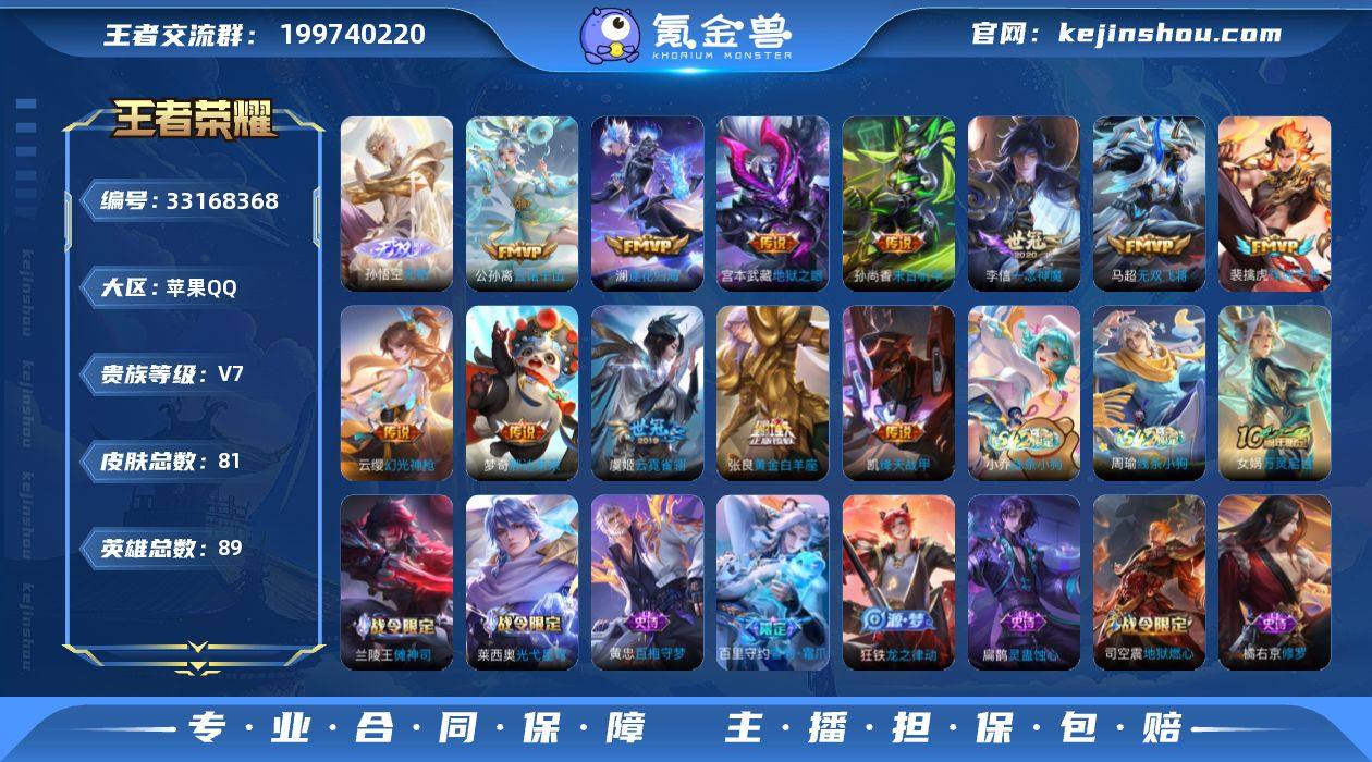 【950509】不能二次 苹果Q-V7-最强王者段位-89英雄-81皮肤-1无双-12传说-26史诗 【英雄全皮】:孙权全皮 【无双皮肤】:孙悟空无相 【传说皮肤】:公孙离云诺千山,云缨幻光神枪,裴擒虎祥瑞亨通,澜逐花归海,马超无双飞将,铠绛天战甲,李信一念神魔,张良黄金白羊座,虞姬云霓雀翎,梦奇胖达荣荣,孙尚香末日机甲,宫本武藏地狱之眼 【限定皮肤】:狄仁杰阴阳师,赵云皇家上将,赵云龙胆,元歌无心,狄仁杰魔术师,项羽海滩派对,司空震地狱燃心 【赛季限定】:钟馗虚灵犬护,甄姬逆浪荇歌,亚瑟荣光之誓 【战令限定】:司空震地狱燃心,兰陵王傩神司,莱西奥光弋星穹,明世隐往忆晖光,周瑜线条小狗,小乔线条小狗 【史诗皮肤】:赵云皇家上将,狄仁杰魔术师,孙尚香水果甜心,妲己魅力维加斯,吕布末日机甲,花木兰水晶猎龙者,兰陵王暗隐猎兽者,诸葛亮黄金分割率,孙策猫狗日记,伽罗箭羽风息,狄仁杰鹰眼统帅,橘右京修罗,赵云龙胆,杨戬天秀启明,元歌无心,司空震地狱燃心,马可波罗星界特工,芈月瑰影绮梦,狂铁龙之律动,扁鹊灵蛊蚀心,百里守约雪豹霜爪,黄忠百相守梦,莱西奥光弋星穹,兰陵王傩神司,女娲万灵启世,小乔线条小狗,周瑜线条小狗 【其他皮肤】:...
