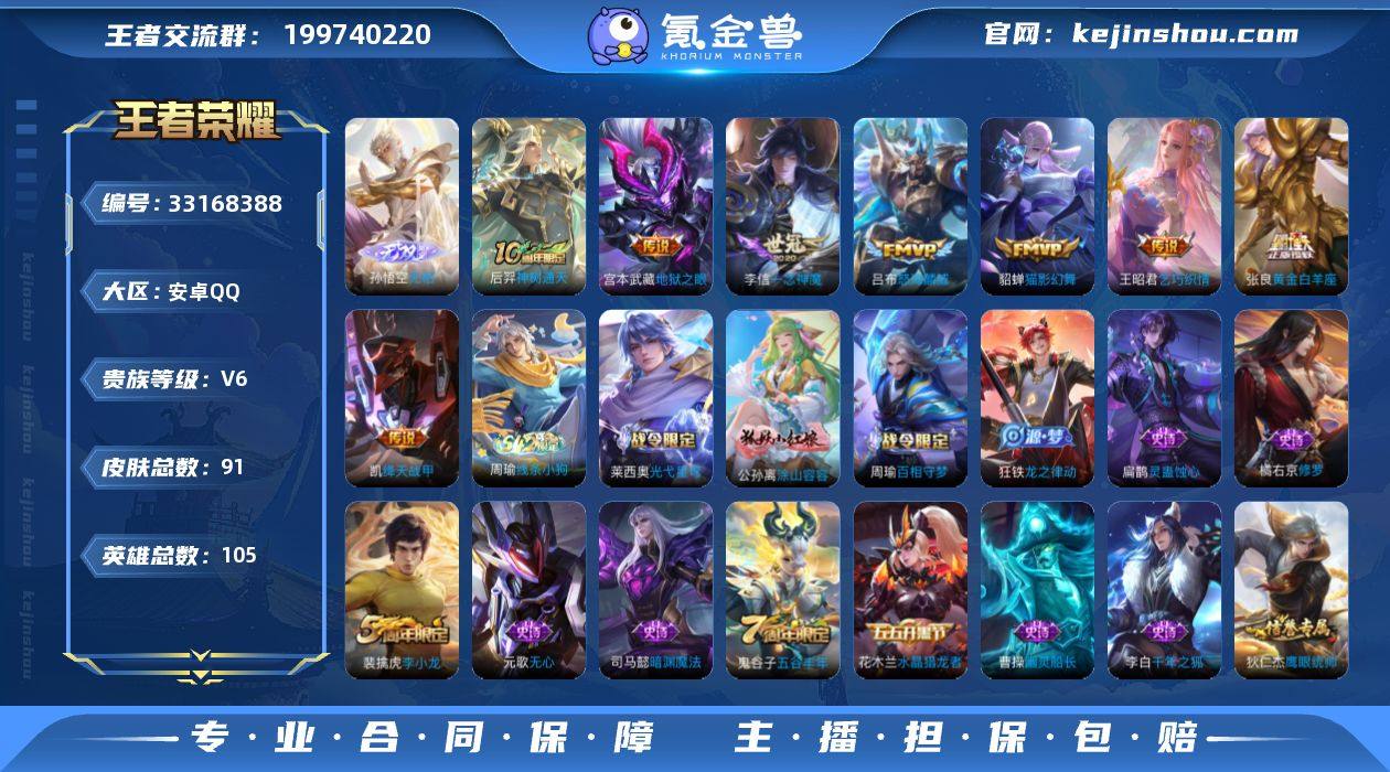 【950526】安卓Q-V6-最强王者段位-105英雄-91皮肤-1无双-8传说-26史诗 HZ262165 【无双皮肤】:孙悟空无相 【传说皮肤】:后羿神树通天,吕布怒海麟威,王昭君乞巧织情,铠绛天战甲,李信一念神魔,貂蝉猫影幻舞,张良黄金白羊座,宫本武藏地狱之眼 【限定皮肤】:狄仁杰阴阳师,赵云皇家上将,元歌无心,狄仁杰魔术师,项羽海滩派对,李元芳云中旅人,钟馗驱傩正仪,鬼谷子五谷丰年,沈梦溪大漠名商,裴擒虎李小龙,裴擒虎擒涛扼浪,桑启海盐诗旅,张良古海寻踪 【赛季限定】:钟馗驱傩正仪,沈梦溪大漠名商,李元芳云中旅人,桑启海盐诗旅,裴擒虎擒涛扼浪,张良古海寻踪,东皇太一噬灭天穹,太乙真人谧流熔炉,钟馗虚灵犬护,甄姬逆浪荇歌,亚瑟荣光之誓 【战令限定】:周瑜百相守梦,孙策百相守梦,莱西奥光弋星穹,明世隐往忆晖光,周瑜线条小狗 【史诗皮肤】:赵云皇家上将,赵云未来纪元,狄仁杰魔术师,宫本武藏鬼剑武藏,孙尚香水果甜心,妲己魅力维加斯,曹操幽灵船长,李白千年之狐,张飞乱世虎臣,花木兰水晶猎龙者,兰陵王暗隐猎兽者,亚瑟心灵战警,阿轲节奏热浪,狄仁杰鹰眼统帅,橘右京修罗,裴擒虎李小龙,杨戬天秀启明,司马懿暗渊魔法,鬼谷子五谷丰年,元...