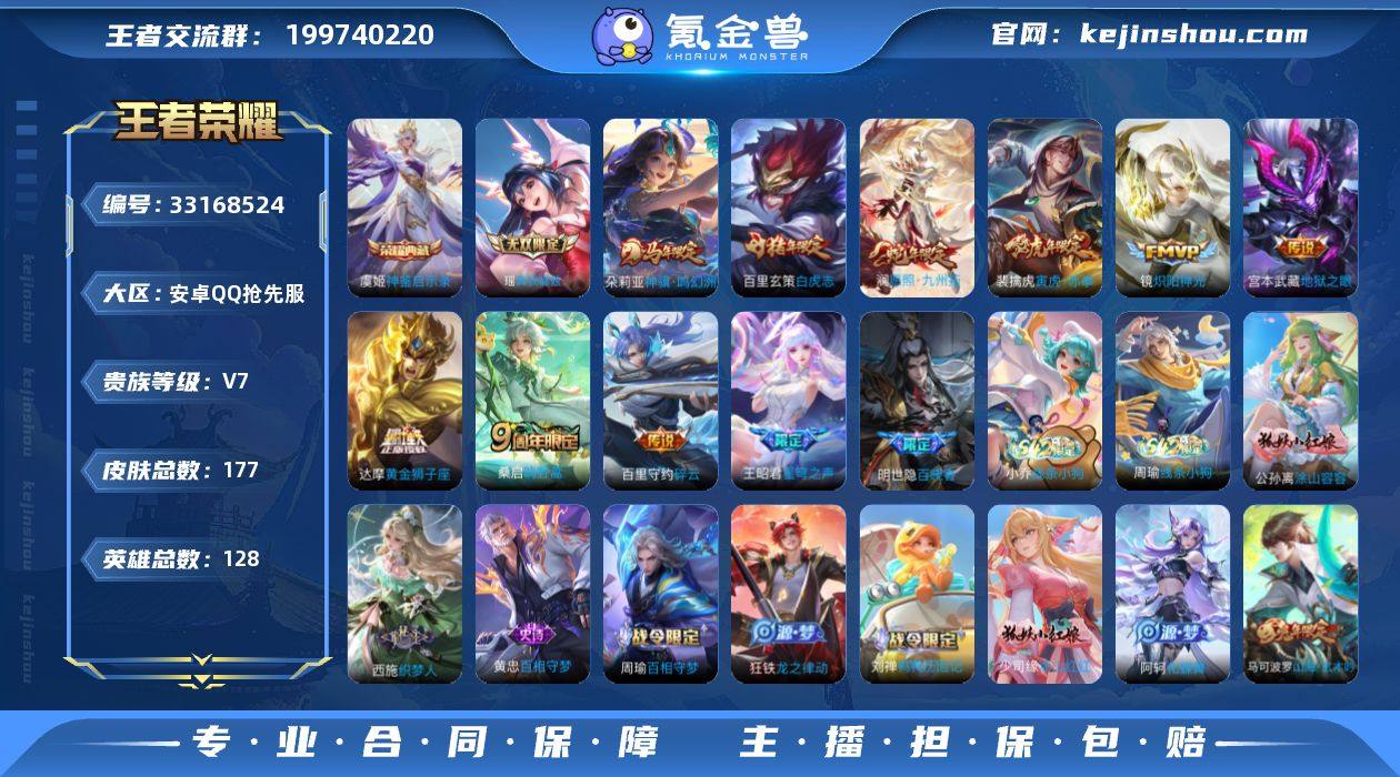【950571】安卓Q抢先服-9金标-V7-至尊星耀IV段位-128英雄-177皮肤-1典藏皮肤-1无双-10传说-56史诗 【英雄全皮】:敖隐全皮 【荣耀典藏】:虞姬神鉴启示录 【无双皮肤】:瑶真我赫兹 【传说皮肤】:朵莉亚神骥鸣幻洲,澜愿照九州拓,桑启鸣野蒿,王昭君星穹之声,百里守约碎云,裴擒虎寅虎赤拳,镜炽阳神光,达摩黄金狮子座,百里玄策白虎志,宫本武藏地狱之眼 【限定皮肤】:蒙犽顽岩魄,蔡文姬夏日便利店,大乔绒语心约,虞姬夏日便利店,姜子牙天穹之誓,狄仁杰阴阳师,赵云皇家上将,元歌无心,马可波罗山海玄木吟,狄仁杰魔术师,项羽海滩派对,王昭君星穹之声,李元芳云中旅人,百里玄策白虎志,梦奇顽趣,裴擒虎寅虎赤拳,裴擒虎擒涛扼浪,上官婉儿神器万象笔,嫦娥拒霜思,嫦娥暖冬兔眠,鲁班大师探海日志,桑启海盐诗旅,暃星界游侠,张良古海寻踪,蒙恬荣光圣徽,鬼谷子天穹祈灯,姬小满妄想食味,百里玄策超元猎域,沈梦溪龙舞盛年,刘邦剑破天穹,周瑜熔金海岸 【年限皮肤】:百里玄策白虎志,裴擒虎寅虎赤拳,马可波罗山海玄木吟,澜愿照九州拓 【赛季限定】:李元芳云中旅人,桑启海盐诗旅,裴擒虎擒涛扼浪,鲁班大师探海日志,张良古海寻踪,鬼谷子天穹祈灯,刘...