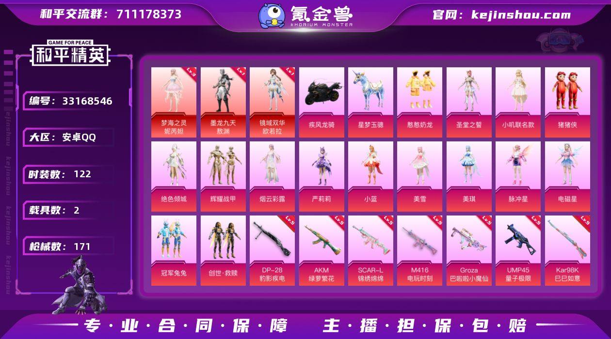 【950598】XS262166 安卓 手Q-无敌战神框-3神装-16粉装-19特效枪-2载具-7粉色飞行器-68202热力值-10王牌印记-122套装-171枪皮 【红色神装等级】:梦海之灵-妮芮妲(三级),墨龙九天-敖渊(一级),镜域双华-欧若拉(一级) 【红色角色神装】:梦海之灵-妮芮妲,墨龙九天-敖渊,镜域双华-欧若拉 【热门品类】:套装-龟仙人 【粉色套装】:粉装-憨憨奶龙,角色-圣堂之誓,角色-小叽联名款,玩偶服-猪猪侠,角色-绝色倾城,粉装-辉耀战甲,角色-烟云彩露,角色-严莉莉,角色-小蓝,角色-美雪,角色-美琪,角色-脉冲星,角色-电磁星,粉装-冠军兔兔,套装-创世·救赎,角色-辉云木星 【粉色枪皮等级】:AKM-绿萝繁花(五级),SCAR-L-锦绣绵绵(五级),M416-电玩时刻(五级),M416-墨龙九天(三级),GROZA-巴啦啦小魔仙(五级),M762-电糖天使(二级),UMP45-恐龙拽拽(四级),UMP45-量子极限(五级),P90-电糖天使(三级),Kar98K-巳巳如意(五级),M24-镜域双华(二级),Mk14-精灵梦叶罗丽(四级),AMR-鸢尾晶梦(四级),M200-梦海之灵(三级),M249-猪猪侠(四级),DP-28-豹影疾电(五级),PKM-江南烟雨(三级) 【粉色载具】:疾风龙骑,星梦玉骢 【粉色枪皮】:AKM-绿萝繁花,SCAR-L-锦绣绵绵,M416-电...