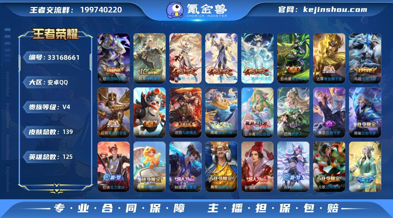 【950622】安卓Q-V4-至尊星耀V段位-125英雄-139皮肤-1典藏皮肤-9传说-34史诗 【荣耀典藏】:铠银白咏叹调 【传说皮肤】:后羿神树通天,司空震愿照山河定,妲己愿照众生和,澜愿照九州拓,马超无双飞将,达摩黄金狮子座,梦奇胖达荣荣,后羿黄金射手座,孙尚香末日机甲 TD2602232 【限定皮肤】:白起狰,狄仁杰阴阳师,赵云皇家上将,嬴政白昼王子,芈月重明,吕布猎兽之王,元歌云间偶戏,夏侯惇朔风刀,曹操烛龙,典韦穷奇,典韦蓝屏警告,狄仁杰魔术师,项羽海滩派对,露娜一生所爱,孙悟空至尊宝,孙悟空大圣娶亲,牛魔御旌,女娲朔望之晖,太乙真人饕餮,弈星混沌棋,狂铁御狮,米莱狄御霄,盾山御銮,张良古海寻踪 【年限皮肤】:司空震愿照山河定,妲己愿照众生和,澜愿照九州拓 【赛季限定】:白起狰,太乙真人饕餮,曹操烛龙,芈月重明,典韦穷奇,狂铁御狮,米莱狄御霄,牛魔御旌,盾山御銮,夏侯惇朔风刀,弈星混沌棋,张良古海寻踪,太乙真人谧流熔炉,甄姬逆浪荇歌,亚瑟荣光之誓,项羽九幽镇关 【战令限定】:嬴政白昼王子,吕布猎兽之王,典韦蓝屏警告,女娲朔望之晖,元歌云间偶戏,孙膑茶境仙,马超访茗客,刘禅鸭鸭历险记,沈梦溪鸭鸭历险记,周瑜百相守梦...
