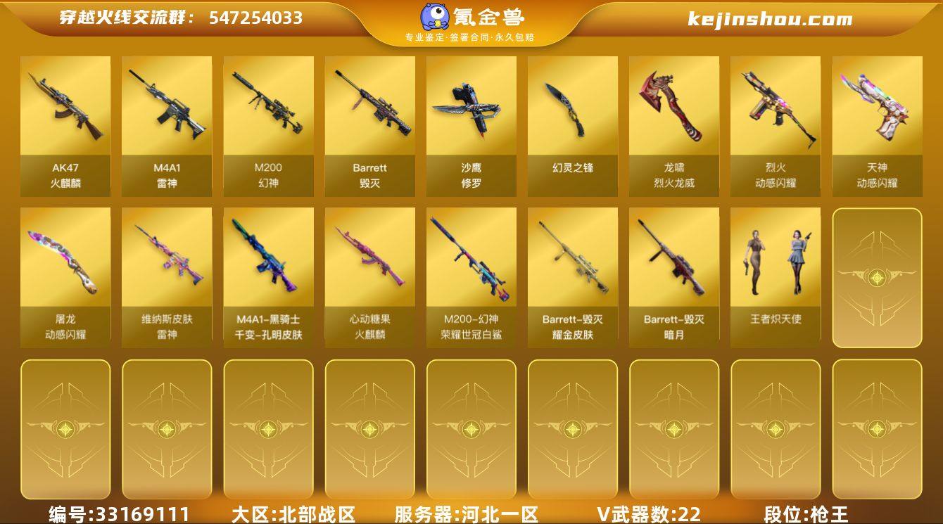 河北一区-26V-1王者武器数-0炫金武器数 【热门武器】:M200-幻神,沙鹰-修罗 【皮肤】:M200-幻神-荣耀世冠白鲨,金色蔷薇-电竞之星 皮肤,裁决-胜者为王 皮肤,雷神-维纳斯皮肤,雷神-神秘按键 皮肤,火麒麟-心动糖果,AK47-火麒麟-百城23冠军皮肤,毁灭-暗月,毁灭耀金皮肤,毁灭-英雄计划 皮肤,M4A1-千变-孔明皮肤,炼狱-末日审判 皮肤 【角色】:王者炽天使,乔伊教练,云海玲珑,幻面灵狐,暗夜-X,初恋灵狐,嘉年华灵狐,娟娟,潘多拉-X,潘多拉-甜心教官,斯沃特-X,兔囡囡,雪莉杨-摸金校尉,樱-战斗天使 【人偶武器】:AWM-灵狐-15周年嘉年华,迷你波特博士,夺魂*2,迷你火种 【暴走生化】:超级对讲机 【挑战大师】:冰龙粉碎者-白马银枪*2,神圣爆裂者-末日III 【英雄级武器】:AK47-火麒麟*2,M4A1-雷神*2,烈火-动感闪耀,HK417-朱雀-电竞之星,天罚-斗烈龙驹,Barrett-毁灭,M200-幻神,沙鹰-修罗,天神-动感闪耀,幻灵之锋,屠龙-动感闪耀,屠龙-电竞之星,屠龙-斗烈龙驹,龙啸-烈火龙威,高爆手雷-幻灵*2,手雷-动感闪耀,闪光弹-幻灵,闪光弹-雷霆王者-觉醒版,烟雾弹-幻灵,AK47-竞魂无影 【源级武器】:源-千变,源·火麒麟*5,魂·火麒麟-百城,御·火麒麟...