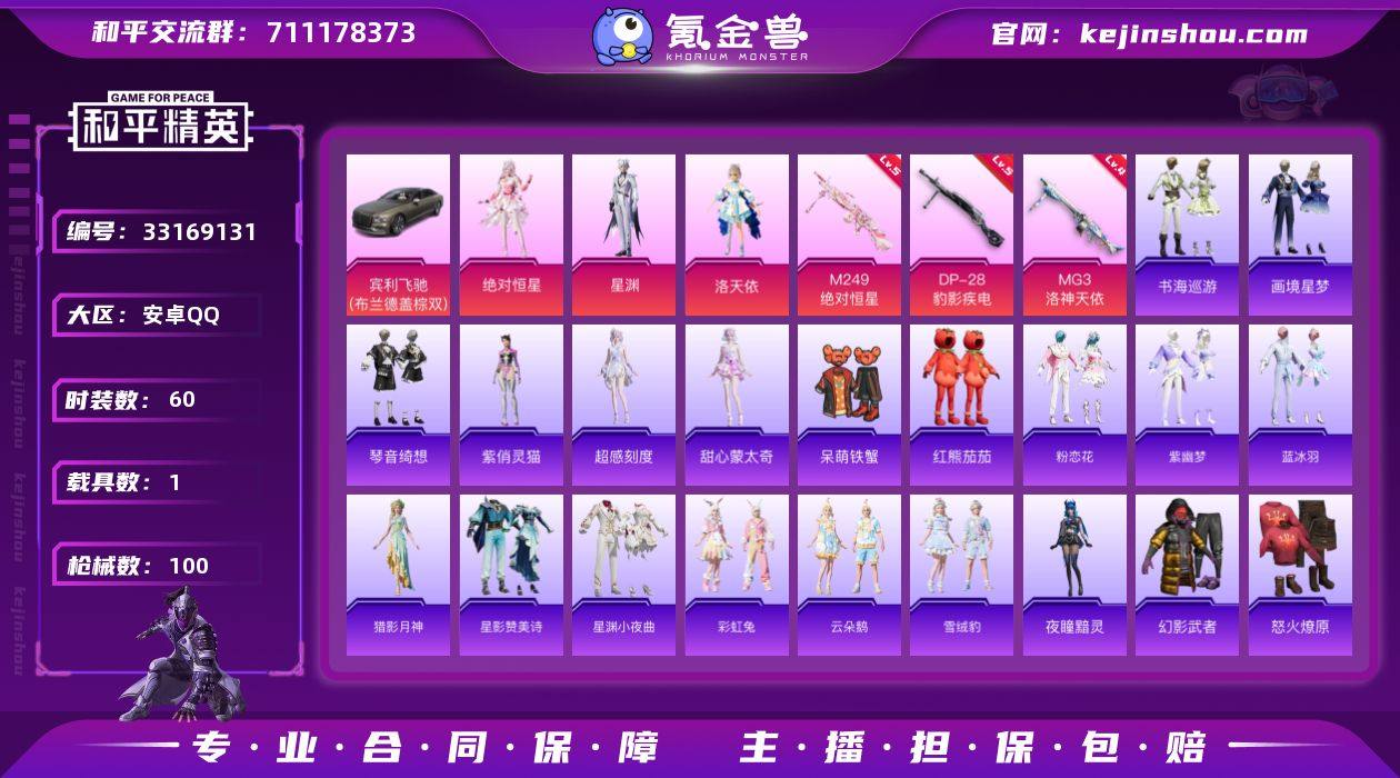 【950792】无二次-安卓 手Q-3粉装-6特效枪-1载具-3粉色飞行器-28998热力值-6王牌印记-60套装-100枪皮 【热门品类】:套装-红熊茄茄 【粉色套装】:角色-绝对恒星,角色-洛天依,角色-星渊 【粉色枪皮等级】:ACE32-萌骑漫游(三级),AKS-74U-森灵之息(五级),Mk14-福马献瑞(五级),M249-绝对恒星(五级),DP-28-豹影疾电(五级),MG3-洛神天依(四级) 【粉色载具】:宾利飞驰(布罗德盖棕双色) 【粉色枪皮】:ACE32-萌骑漫游,AKS-74U-森灵之息,Mk14-福马献瑞,M249-绝对恒星,DP-28-豹影疾电,MG3-洛神天依 【粉色飞行器】:绝对恒星飞行器,炫彩糖果飞行器,暮色之舞飞行器 【粉色降落伞】:绝对恒星降落伞,洛神天依降落伞,星穹咏叹调降落伞,幻彩电音降落伞,极意拳锋降落伞,炫彩糖果降落伞,暮色玫影降落伞,虹云熊熊降落伞 【稀有套装】:角色-超感刻度,角色-甜心蒙太奇,套装-雪国风尚,套装-炫彩糖果,套装-马上来财,套装-粉恋花,套装-紫幽梦,套装-蓝冰羽,角色-猎影月神,套装-星影赞美诗,套装-星渊小夜曲,套装-彩虹兔,套装-云朵鹅,套装-雪绒豹,角色-夜瞳黯灵,角色-紫俏灵猫,套装-书海巡游,套装-画境星梦,套装-琴音绮想,套装-粉彩缠枝,套装-雨过天青...