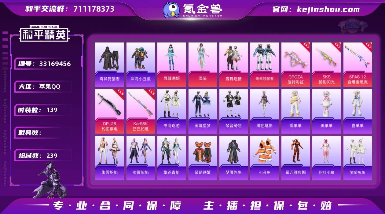 【950904】苹果 手Q-4粉装-7特效枪-0载具-5粉色飞行器-70155热力值-9王牌印记-139套装-239枪皮 【热门品类】:套装-深海小丑鱼,套装-小丑鱼,套装-奇异狩猎者,角色-军刀雅典娜,套装-粉红小猪 【粉色套装】:粉装-蝶舞迷情,粉装-未来领航者,角色-灵玺,角色-异瞳寒姬 【粉色枪皮等级】:GROZA-旋转彩虹(七级),UMP45-萌骑冒险(五级),Kar98K-巳巳如意(五级),SKS-碧影闪光(七级),Mk14-福马献瑞(四级),SPAS-12-音爆索尼克(七级),DP-28-豹影疾电(五级) 【粉色枪皮】:GROZA-旋转彩虹,UMP45-萌骑冒险,Kar98K-巳巳如意,SKS-碧影闪光,Mk14-福马献瑞,SPAS-12-音爆索尼克,DP-28-豹影疾电 【粉色飞行器】:炫彩糖果飞行器,太空嘟嘟飞行器,BEARBRICK飞行器,极意拳锋飞行器,天空之门飞行器 【粉色降落伞】:幻影战神降落伞,星之彼岸降落伞,蓝莓炮弹降落伞,旋转彩虹降落伞,青空秋雨降落伞,仲夏莫吉托降落伞,时空协奏降落伞,BEARBRICK降落伞,精灵之光降落伞,千金淑猫降落伞,动力核心降落伞,喜羊羊与灰太狼降落伞,异瞳寒姬降落伞,炫彩糖果降落伞,虹云熊熊降落伞 【稀有套装】:套装-雪国风尚,套装-炫彩糖果,套装-马上有钱,套装-雏菊兔兔,套装-萝兰蝴蝶...