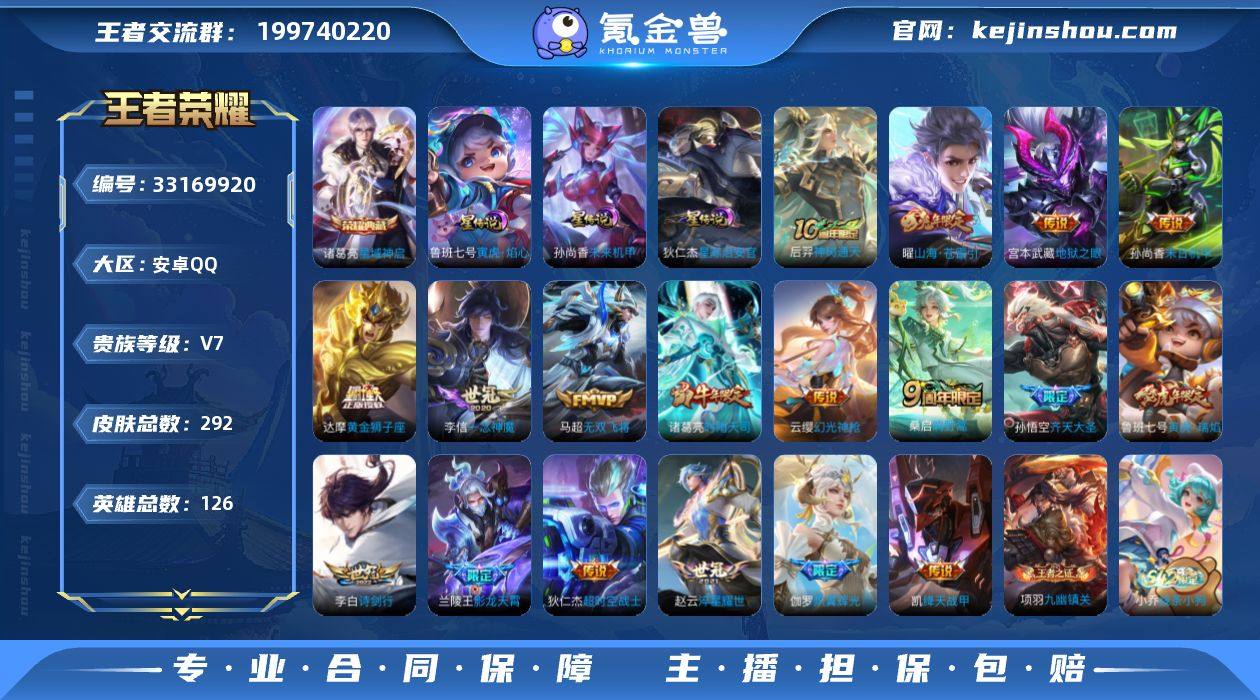 安卓Q-V7-最强王者段位-126英雄-292皮肤-1典藏皮肤-18传说-70史诗 【英雄全皮】:孙权全皮,敖隐全皮,影全皮 【荣耀典藏】:诸葛亮星域神启 【传说皮肤】:后羿神树通天,云缨幻光神枪,桑启鸣野蒿,兰陵王影龙天霄,伽罗炽翼辉光,孙悟空齐天大圣,曜山海苍雷引,李白诗剑行,马超无双飞将,鲁班七号寅虎瑞焰,赵云淬星耀世,诸葛亮时雨天司,铠绛天战甲,李信一念神魔,达摩黄金狮子座,孙尚香末日机甲,宫本武藏地狱之眼,狄仁杰超时空战士 【限定皮肤】:蒙犽顽岩魄,大乔绒语心约,姜子牙天穹之誓,狄仁杰阴阳师,赵云皇家上将,墨子神迹守卫,孙尚香蔷薇恋人,鲁班七号寅虎瑞焰,庄周高山流水,钟无艳超时空战士,芈月幻夜卜梦,元歌无心,甄姬落雪兰心,狄仁杰魔术师,狄仁杰万华元夜,达摩沙漠行僧,项羽海滩派对,老夫子醍醐杖,老夫子航海奇遇记,程咬金演武夺筹,兰陵王影龙天霄,兰陵王金庭之子,孙悟空至尊宝,孙悟空齐天大圣,后羿如梦令,李元芳云中旅人,钟馗神迹守卫,钟馗驱傩正仪,杨玉环遇见飞天,雅典娜黎明之约,鬼谷子原初探秘者,鬼谷子五谷丰年,诸葛亮时雨天司,黄忠火炮绅士,苏烈千军破阵,百里玄策原初追逐者,弈星混沌棋,梦奇顽趣,沈梦溪大...