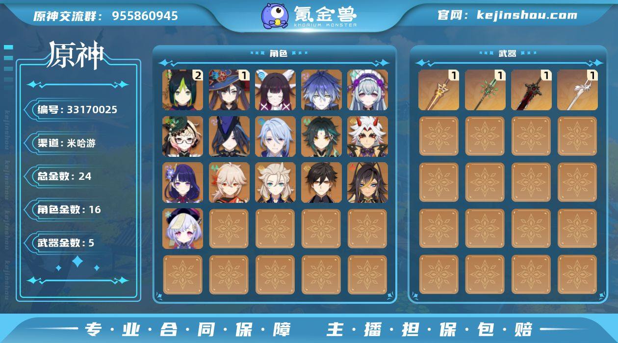 56级/24黄/男主/16个五星角色/5个五星武器 0命克洛琳德,0命迪希雅,2命提纳里,0命神里绫人,0命荒泷一斗,0命雷电将军,0命枫原万叶,0命钟离,0命魈,0命阿贝多,0命七七,1命莫娜,0命艾梅莉埃,0命梦见月瑞希,0命菲林斯,0命哥伦比娅,精1圣显之钥,精1和璞鸢,精1风鹰剑,精1狼的末路