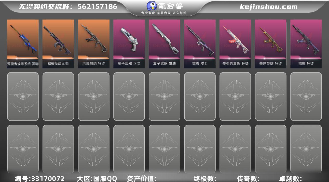 【套装】:VCT 2025 赛季套装,西部未来套装,掠影套装 【英雄】:幻棱,炼狱,维斯,暮蝶,钛狐,壹决,铁臂,捷风,雷兹,幽影,不死鸟,贤者,猎枭,蝰蛇,零,芮娜,奇乐,尚勃勒,霓虹,斯凯,夜露,星礈,K/O,海神,盖可,黑梦,钢锁 【近战武器】:近战武器-VCT 2025 爪刀,近战武器-黑波之刃,近战武器-威龙之刃,近战武器-鬼丸国纲,近战武器-未来开拓者,近战武器-流星兵团 短剑,近战武器-超限闪存 匕首,近战武器-荒土机兵 热能刀,近战武器-影刃,近战武器-诡秘蛇影 军刀,近战武器-神圣领域 战刀 【狂徒】:狂徒-洪荒怒焰,狂徒-掠影,狂徒-盖世英雄,狂徒-盖亚的复仇,狂徒-荒土机兵,狂徒-流星兵团,狂徒-诡秘蛇影 【幻影】:幻影-黯夜怪谈,幻影-西部未来,幻影-超限闪存,幻影-神圣领域,幻影-纳米打击,幻影-末日之翼,幻影-西部未来 【戍卫】:戍卫-掠影,戍卫-浮光跃金,戍卫-逆冲蛮牛,戍卫-战术熊与伙伴们,戍卫-月球哨兵,戍卫-折光棱晶 【獠犬】:獠犬-神圣领域,獠犬-模拟赫兹,獠犬-逆冲蛮牛 【冥驹】:冥驹-源能者娱乐系统,冥驹-掠影,冥驹-荒土机兵,冥驹-模拟赫兹,冥驹-星云暗涌 【飞将】:飞将-西部未来,飞将-战术熊与伙伴们,飞将-末日之...