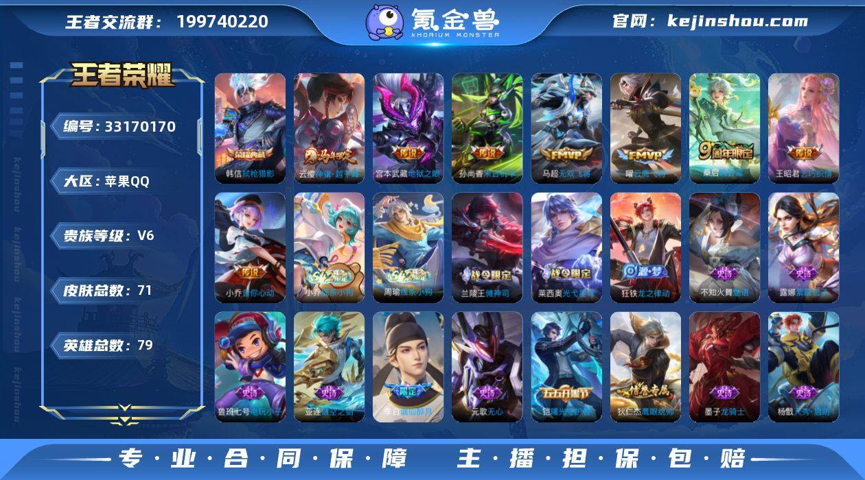 【951064】无二次-苹果Q-V6-最强王者段位-79英雄-71皮肤-1典藏皮肤-8传说-25史诗 【荣耀典藏】:韩信弑枪猎影 【传说皮肤】:云缨神骥越千峰,桑启鸣野蒿,马超无双飞将,王昭君乞巧织情,小乔音你心动,曜云鹰飞将,孙尚香末日机甲,宫本武藏地狱之眼 【限定皮肤】:李白谪仙醉月,狄仁杰阴阳师,赵云皇家上将,元歌无心,狄仁杰魔术师,项羽海滩派对,沈梦溪星空之诺,妲己灵卜魔法,沈梦溪龙舞盛年 【赛季限定】:东皇太一噬灭天穹,太乙真人谧流熔炉,亚瑟荣光之誓 【战令限定】:沈梦溪星空之诺,妲己灵卜魔法,亚连破空之剑,孙悟空神迹守卫,老夫子百相守梦,兰陵王傩神司,莱西奥光弋星穹,明世隐往忆晖光,周瑜线条小狗,小乔线条小狗 【史诗皮肤】:周瑜线条小狗,小乔线条小狗,兰陵王傩神司,莱西奥光弋星穹,狂铁龙之律动,李白谪仙醉月,亚连破空之剑,妲己灵卜魔法,元歌无心,杨戬天秀启明,不知火舞魅语,狄仁杰鹰眼统帅,大乔猫狗日记,阿轲节奏热浪,铠曙光守护者,雅典娜冰冠公主,小乔缤纷独角兽,张飞乱世虎臣,墨子龙骑士,孙尚香水果甜心,宫本武藏鬼剑武藏,狄仁杰魔术师,王昭君偶像歌手,赵云未来纪元,赵云皇家上将,露娜紫霞仙子,鲁班七号电玩...