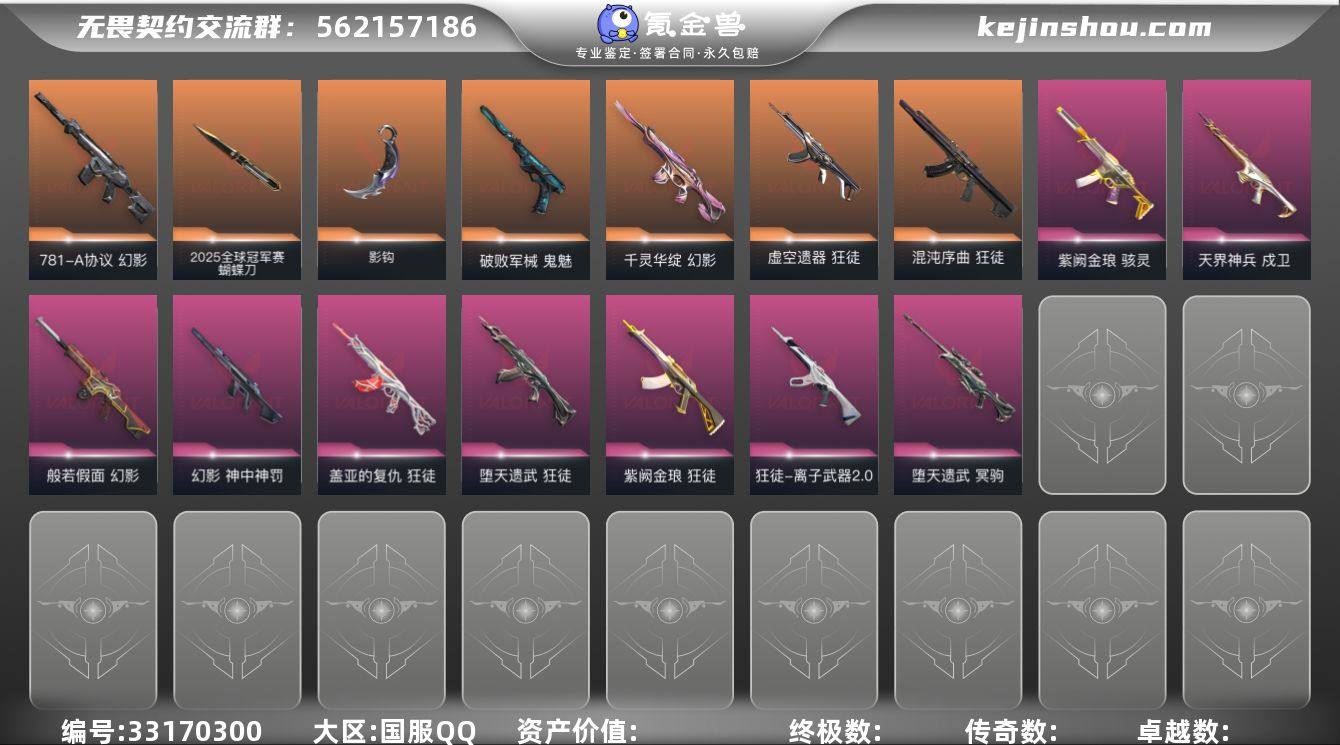 【套装】:2025全球冠军赛套装,2022全球冠军赛套装 【英雄】:幻棱,炼狱,维斯,暮蝶,钛狐,壹决,铁臂,捷风,雷兹,幽影,不死鸟,贤者,猎枭,蝰蛇,零,芮娜,奇乐,尚勃勒,霓虹,斯凯,夜露,星礈,K/O,海神,盖可,黑梦,钢锁 【近战武器】:近战武器-2025全球冠军赛 蝴蝶刀,近战武器-2022全球冠军赛 蝴蝶刀,近战武器-碎心裂刃,近战武器-影钩,近战武器-落英飞旋,近战武器-镭切,近战武器-诡秘蛇影 军刀,近战武器-日耀风暴 遗器,近战武器-阿特拉斯指挥部 甩棍,近战武器-星际猎兵 短剑 【狂徒】:狂徒-2025全球冠军赛,狂徒-混沌序曲,狂徒-全息波普//2.0,狂徒-塑水宗,狂徒-虚空遗器,狂徒-堕天遗武,狂徒-盖亚的复仇,狂徒-紫阙金琅,狂徒-离子武器//2.0,狂徒-诡秘蛇影 【幻影】:幻影-2022全球冠军赛,幻影-千灵华绽,幻影-781-A协议,幻影-般若假面,幻影-异鳞魔蛇,幻影-神中神罚,幻影-神圣领域,幻影-末日之翼 【戍卫】:戍卫-天界神兵,戍卫-月球哨兵,戍卫-折光棱晶 【獠犬】:獠犬-神圣领域 【冥驹】:冥驹-堕天遗武,冥驹-星云暗涌 【飞将】:飞将-末日之翼 【莽侠】:莽侠-创·纪元,莽侠-诡秘蛇影,莽侠-月球哨兵 【战神】:战神-神圣领域 【...
