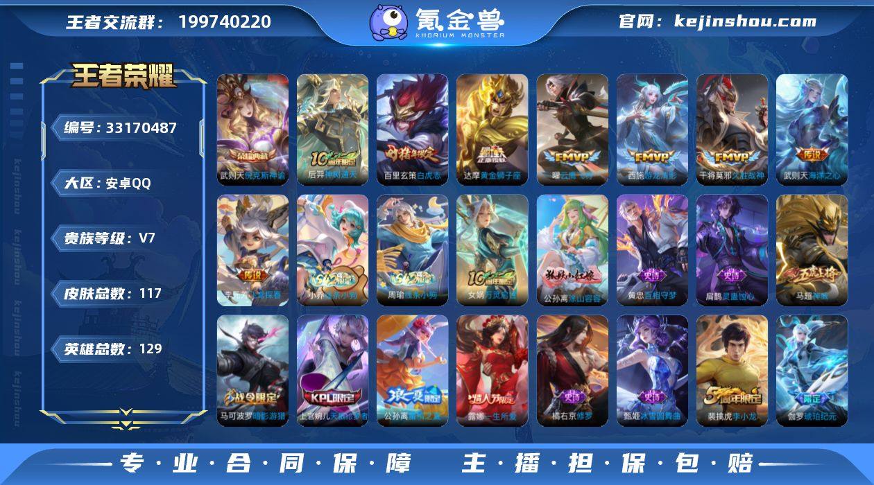 【951223】无二次-安卓Q-V7-永恒钻石I段位-129英雄-117皮肤-1典藏皮肤-1典藏英雄-8传说-41史诗 【荣耀典藏】:武则天英雄,武则天倪克斯神谕 【传说皮肤】:后羿神树通天,西施游龙清影,李元芳飞鸢探春,曜云鹰飞将,干将莫邪久胜战神,达摩黄金狮子座,百里玄策白虎志,武则天海洋之心 【限定皮肤】:狄仁杰阴阳师,赵云皇家上将,墨子神迹守卫,嬴政优雅恋人,嬴政白昼王子,吕布猎兽之王,马可波罗暗影游猎,狄仁杰魔术师,狄仁杰万华元夜,达摩沙漠行僧,项羽海滩派对,老夫子醍醐杖,老夫子航海奇遇记,程咬金演武夺筹,露娜一生所爱,花木兰瑞麟志,牛魔御旌,钟馗驱傩正仪,女娲朔望之晖,雅典娜单词大作战,蔡文姬繁星吟游,鬼谷子原初探秘者,苏烈千军破阵,百里玄策白虎志,公孙离蜜橘之夏,明世隐疑决卦,裴擒虎李小龙,裴擒虎擒涛扼浪,米莱狄御霄,盾山御銮,猪八戒西部大镖客,上官婉儿梁祝,上官婉儿天狼绘梦者,阿古朵江河有灵,张良古海寻踪,鬼谷子天穹祈灯,伽罗琥珀纪元 【年限皮肤】:花木兰瑞麟志,百里玄策白虎志 【赛季限定】:米莱狄御霄,牛魔御旌,盾山御銮,明世隐疑决卦,老夫子醍醐杖,鬼谷子原初探秘者,狄仁杰万华元夜,程咬金演武夺筹,钟...