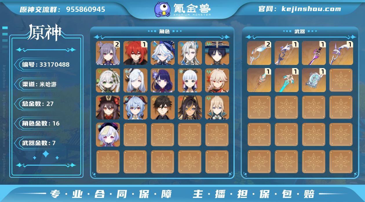 56级/27黄/男主/16个五星角色/7个五星武器 0命芙宁娜,0命那维莱特,0命迪希雅,0命流浪者,0命纳西妲,0命申鹤,0命雷电将军,0命枫原万叶,0命神里绫华,0命钟离,0命胡桃,0命甘雨,2命刻晴,0命七七,0命琴,1命迪卢克,精2白雨心弦,精1若水,精1雾切之回光,精1四风原典,精1天空之脊,精1阿莫斯之弓,精1天空之刃