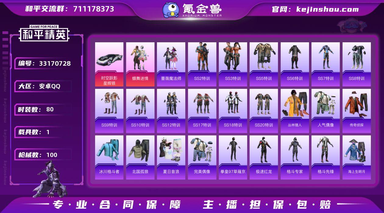 【951197】不可二次-安卓 手Q-2粉装-0特效枪-1载具-0粉色飞行器-28228热力值-4王牌印记-80套装-100枪皮 【粉色套装】:粉装-蝶舞迷情 【粉色载具】:时空跃影(星辉银) 【粉色降落伞】:深海曼妙降落伞,华贵君王降落伞 【稀有套装】:套装-迅捷龙虾,套装-雨过天青,套装-红釉青花,套装-燕雀桃枝 【稀有枪皮】:AKM-星之信仰,AKM-生命誓言,AKM-破晓战魂,AKM-霓虹街区,M16A4-龙虾霸霸,SCAR-L-红色方程式,SCAR-L-金风玉露,M416-红色方程式,M416-蓝色火焰,GROZA-春暖花开,GROZA-暗夜武装,GROZA-黑色刀锋,AUG-耀粉歌者,AUG-魔法学院,M762-拳皇97,M762-牛气冲天,M762-绯红前夜,G36C-不夜海上花,UZI-众神之王,UZI-古堡领主,UZI-生命誓言,UZI-金风玉露,UMP45-天启纪元,Vector-生命誓言,Vector-黑色刀锋,汤姆逊-勇闯险境,汤姆逊-像素花束,MP5K-众神之王,MP7-G-锦灰蝶梦,Kar98K-勇闯险境,Kar98K-华贵君王,Kar98K-王子的夏天,Kar98K-红色方程式,M24-众神之王,SKS-勇闯险境,SKS-夜灯,SKS-玉龙,VSS-黑色刀锋,Mini14-春暖花开,Mini14-炫彩节奏,Mini14-耀粉歌者,Mini14-金鼠迎春,SLR-PEC最牛战神,SLR-众神之王,QBU-不夜海上花,M417-锦灰蝶...