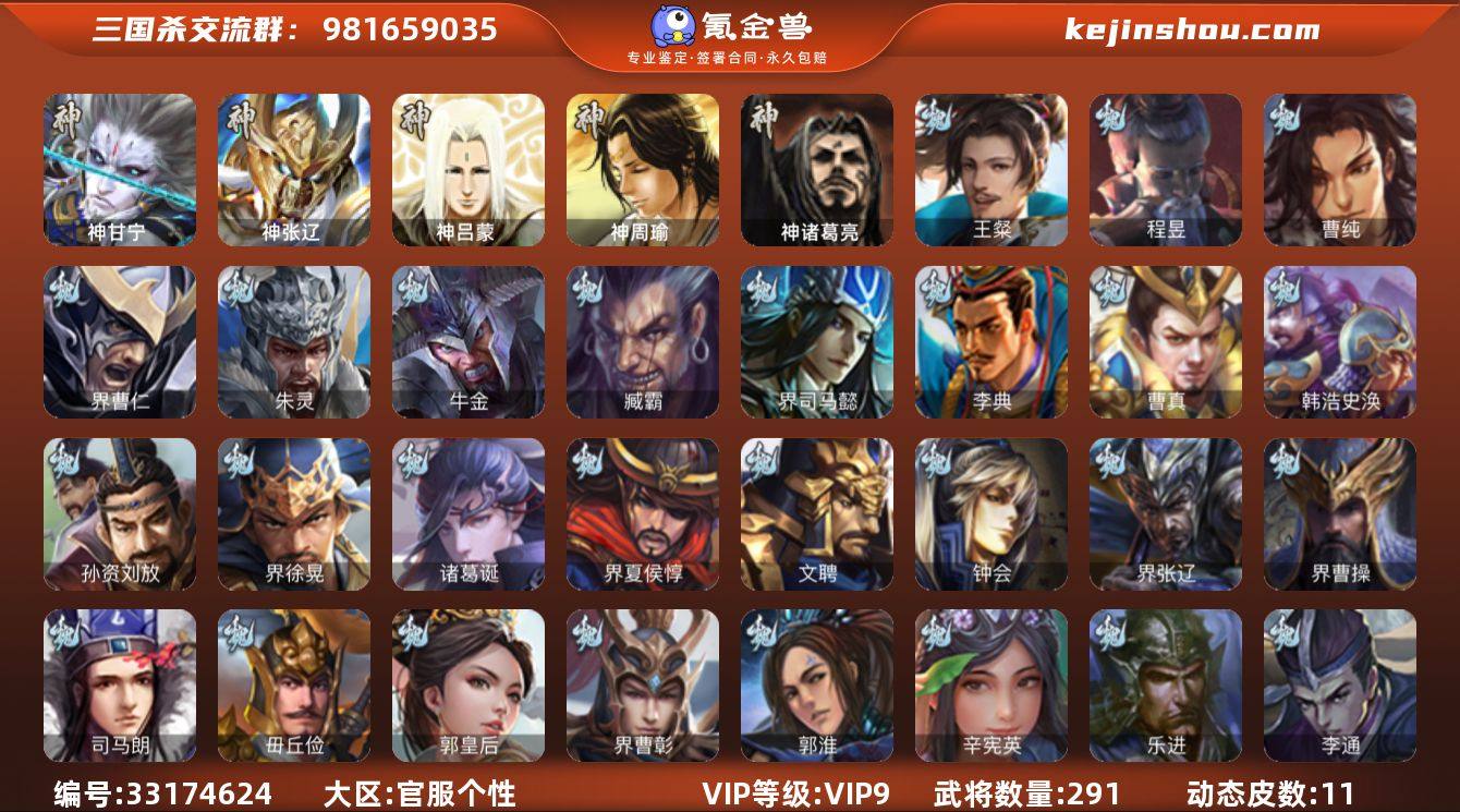 VIP等级: VIP9 官阶: 骠骑将军 武将数量: 291 动态皮肤数量: 11 神将: 神甘宁,神张辽,神吕蒙,神周瑜,神诸葛亮 魏国武将: 曹纯,程昱,王粲,唐咨-魏,张辽,SP曹仁,SP关羽,SP贾诩,SP姜维,SP庞德,卞夫人,曹昂,曹操,曹冲,曹洪,曹丕,曹仁,曹叡,王异,张恭,鲁芝,界满宠,曹休,界曹植,满宠,荀攸,钟繇,郭嘉,荀彧,杜畿,界郭嘉,崔琰,界曹丕,界荀彧,朱灵,吕虔,界陈群,界王异,界许褚,陈群,界邓艾,界典韦,界曹休,李通,乐进,辛宪英,郭淮,界曹彰,郭皇后,毌丘俭,夏侯惇,司马朗,界曹操,许褚,界张辽,谋徐晃,张郃,钟会,文聘,界夏侯惇,诸葛诞,司马懿,甄姬,界徐晃,徐晃,界曹仁,孙资刘放,韩浩史涣,曹真,典韦,夏侯渊,李典,于禁,邓艾,界司马懿,臧霸,牛金,朱灵(国战) 蜀国武将: 界黄忠,马云騄,徐庶,界魏延,杨仪,界关羽,界诸葛亮,界伊籍,费祎,严颜,界黄月英,赵云,张松,李丰,界刘备,界刘禅,刘封,糜竺,黄月英,关羽,吴懿,向宠,祝融,张飞,黄皓,陈震,魏延,马忠,界法正,糜夫人,界孟获,刘禅,界赵云,界姜维,关银屏,界祝融,SP孙尚香,SP徐庶,卧龙诸葛,周仓,简雍,界关兴张苞,诸葛亮,孙乾,界张飞,界卧龙诸葛,法正,界简雍,赵统赵广,陈到,界马岱,关平,马岱,界庞统,庞统,诸葛果,谋张飞,马谡,马超,廖化,关兴张苞,孟获,夏侯氏,...