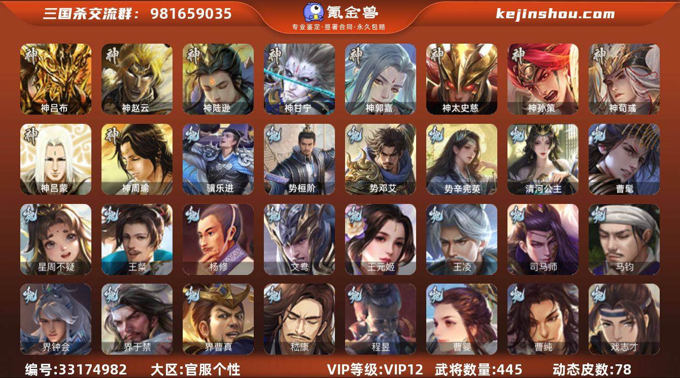 VIP等级: VIP12 官阶: 大将军 武将数量: 445 动态皮肤数量: 78 神将: 神甘宁,神郭嘉,神陆逊,神吕布,神孙策,神太史慈,神荀彧,神赵云,神吕蒙,神周瑜 魏国武将: 戏志才,曹纯,曹婴,程昱,嵇康,界曹真,界于禁,界钟会,马钧,司马师,王凌,王元姬,文鸯,杨修,王粲,唐咨-魏,张辽,SP蔡文姬,SP曹仁,SP关羽,SP贾诩,SP姜维,SP庞德,卞夫人,蔡贞姬,曹昂,曹操,曹冲,曹洪,曹丕,曹仁,曹叡,王异,张恭,鲁芝,界满宠,曹休,界曹植,满宠,荀攸,王基,钟繇,蒯越蒯良,郭嘉,牵招,荀彧,阮慧,杜畿,界郭嘉,崔琰,界曹丕,界荀彧,朱灵,界甄姬,吕虔,界王异,界许褚,界郭淮,华歆,陈群,界邓艾,界典韦,界曹休,袁涣,李通,乐进,辛宪英,郭淮,界曹彰,郭皇后,毌丘俭,夏侯惇,曹植,司马朗,谋于禁,界曹操,星周不疑,许褚,界张辽,谋徐晃,张郃,钟会,文聘,曹彰,界夏侯惇,诸葛诞,司马懿,甄姬,杨阜,界徐晃,徐晃,界曹仁,孙资刘放,韩浩史涣,曹真,典韦,界夏侯渊,夏侯渊,李典,于禁,王双,邓艾,界司马懿,张春华,孟达-魏,臧霸,牛金,朱灵(国战),曹髦,清河公主,司马伷,董昭,谋张辽,势辛宪英,势邓艾,势桓阶,骥乐进 蜀国武将: 关索,花鬘,界黄忠,谯周,沙摩柯,诸葛瞻,谋马超,谋赵云,马云騄,谋黄月英,徐庶,界魏延,杨仪,吕凯,界关羽,界诸葛亮,邓芝,界伊...