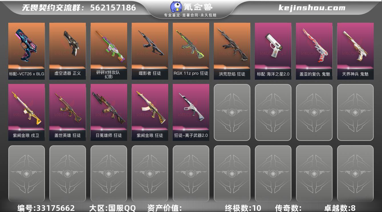 【kywwqy49】【英雄】:幻棱,炼狱,维斯,暮蝶,钛狐,壹决,铁臂,捷风,雷兹,不死鸟,贤者,猎枭,蝰蛇,零,芮娜,奇乐,尚勃勒,斯凯,夜露,K/O,海神,黑梦,钢锁 【近战武器】:近战武器-碎心裂刃,近战武器-剥皮小刀,近战武器-紫金爪刀 【狂徒】:狂徒-洪荒怒焰,狂徒-噬影者,狂徒-RGX 11z Pro,狂徒-盖世英雄,狂徒-日冕雄师,狂徒-紫阙金琅,狂徒-离子武器//2.0 【幻影】:幻影-砰砰X特攻队 【戍卫】:戍卫-紫阙金琅 【标配】:标配-海洋之星//2.0 【VCT手枪】:标配-VCT26 x BLG 【正义】:正义-虚空遗器,正义-超限闪存,正义-纳米打击 【鬼魅】:鬼魅-盖亚的复仇,鬼魅-天界神兵,鬼魅-星云暗涌 【卡面】:终章:激斗汉堡 卡面,进入射程 卡面,《双城之战》拥抱 卡面,精灵大战 卡面,欢迎来到底城 卡面,南瓜盛典 卡面,修车达人 卡面,正义的化身 卡面,钢锁工牌 卡面,流星兵团 卡面,无畏契约GO!第一卷:芮娜 卡面,无畏契约GO!第一卷:零 卡面,《双城之战》金克丝 卡面,代号红色 卡面,新兵报到 卡面,V契约 卡面,无畏契约 卡面,#拯救宽体奇乐 卡面 【喷漆】:嗨宝南瓜灯 喷漆,嘭! 喷漆,都算到了 喷漆,控场勿近 喷漆,小丑猫 喷漆,熊抱 喷...
