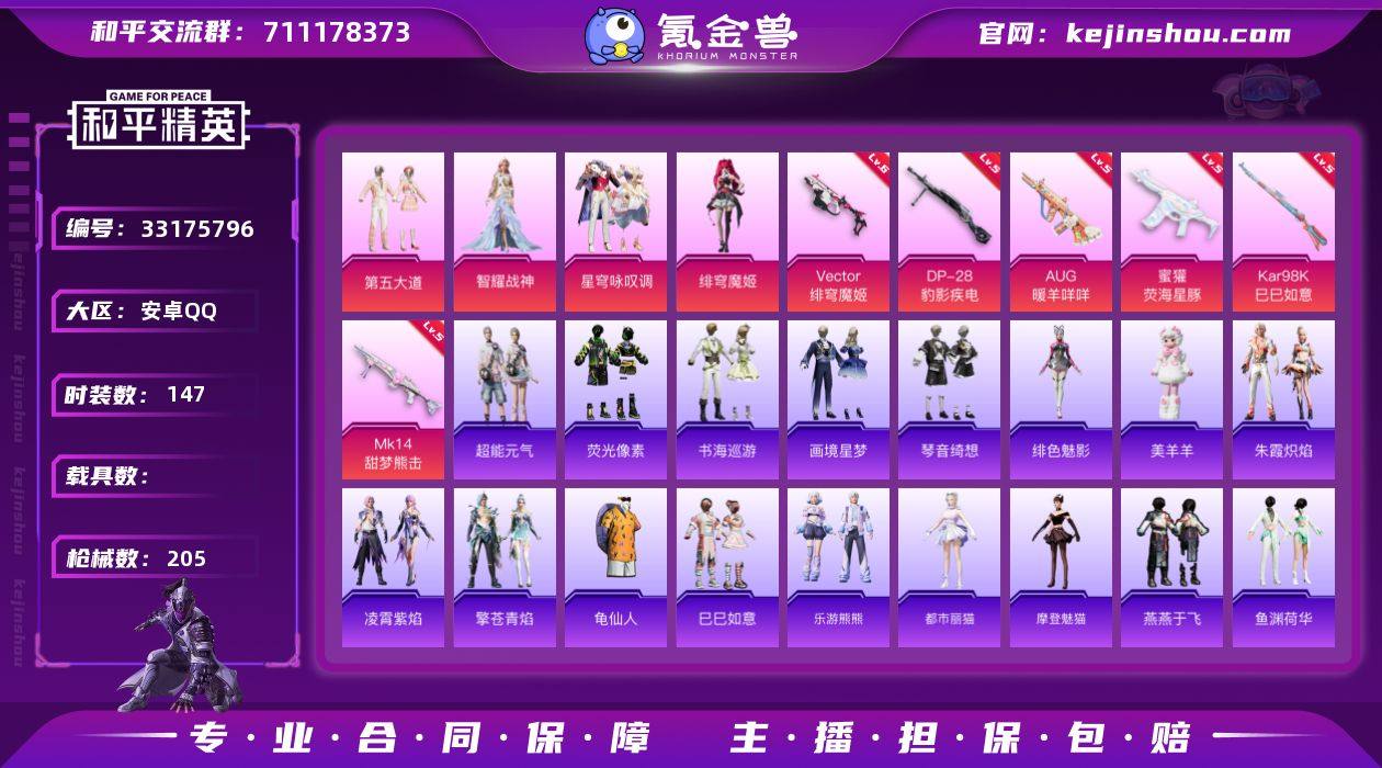 【kyhp1704】安卓 手Q-6粉装-9特效枪-0载具-2粉色飞行器-59089热力值-4王牌印记-147套装-205枪皮 【热门品类】:套装-龟仙人 【粉色套装】:粉装-第五大道,角色-智耀战神,粉装-星穹咏叹调,角色-绯穹魔姬,角色-罪夜之冕,角色-鸢尾珑雾 【粉色枪皮等级】:AUG-暖羊咩咩(五级),蜜獾-荧海星豚(五级),Vector-绯穹魔姬(六级),AKS-74U-森灵之息(五级),Kar98K-巳巳如意(五级),Mk14-甜梦熊击(五级),Mk14-福马献瑞(五级),AA12-G-萌骑幻想(三级),DP-28-豹影疾电(五级) 【粉色枪皮】:AUG-暖羊咩咩,蜜獾-荧海星豚,Vector-绯穹魔姬,AKS-74U-森灵之息,Kar98K-巳巳如意,Mk14-甜梦熊击,Mk14-福马献瑞,AA12-G-萌骑幻想,DP-28-豹影疾电 【粉色飞行器】:炫彩糖果飞行器,极意拳锋飞行器 【粉色降落伞】:四圣焕新降落伞,彩虹甜喵降落伞,江南烟雨降落伞,千金淑猫降落伞,樱桃泡泡降落伞,智耀战神降落伞,星穹咏叹调降落伞,幻彩电音降落伞,时光之吻降落伞,绯穹魔姬降落伞,喜羊羊与灰太狼降落伞,异瞳寒姬降落伞,炫彩糖果降落伞,霁蓝缠春降落伞,辉云木星降落伞 【稀有套装】:套装-龟仙人,套装-巳巳如意,套装-乐游熊熊,套装-超能元气,套装-荧光像素,套装-炫彩...