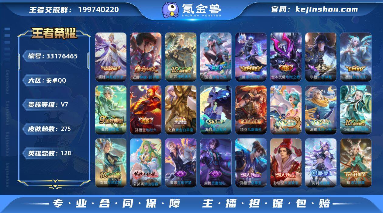 【AZW329】安卓Q-V7-至尊星耀IV段位-128英雄-275皮肤-1典藏皮肤-10传说-77史诗 【英雄全皮】:姜子牙全皮,孙权全皮,敖隐全皮,空空儿全皮 【荣耀典藏】:虞姬神鉴启示录 【传说皮肤】:云缨神骥越千峰,后羿神树通天,桑启鸣野蒿,亚连落雪白狼,澜逐花归海,西施游龙清影,李信一念神魔,张良黄金白羊座,宫本武藏地狱之眼,孙悟空地狱火 【限定皮肤】:白起狰,姜子牙天穹之誓,狄仁杰阴阳师,虞姬凯尔特女王,赵云皇家上将,妲己时之彼端,孙尚香蔷薇恋人,鲁班七号狮舞东方,庄周玄嵩,高渐离死亡摇滚,钟无艳王者之锤,孙膑妖精王,扁鹊炼金王,芈月重明,周瑜赤莲之焰,元歌无心,夏侯惇朔风刀,曹操烛龙,典韦穷奇,狄仁杰魔术师,狄仁杰万华元夜,达摩沙漠行僧,项羽海滩派对,老夫子醍醐杖,程咬金演武夺筹,兰陵王驯魔猎人,兰陵王金庭之子,孙悟空至尊宝,孙悟空大圣娶亲,牛魔御旌,后羿如梦令,李元芳银河之约,李元芳云中旅人,钟馗神迹守卫,钟馗驱傩正仪,干将莫邪胡桃夹子,雅典娜黎明之约,蔡文姬繁星吟游,太乙真人饕餮,太乙真人华丽摇滚,鬼谷子原初探秘者,鬼谷子五谷丰年,苏烈千军破阵,百里玄策原初追逐者,弈星混沌棋,梦奇顽趣,沈梦溪星空之诺...