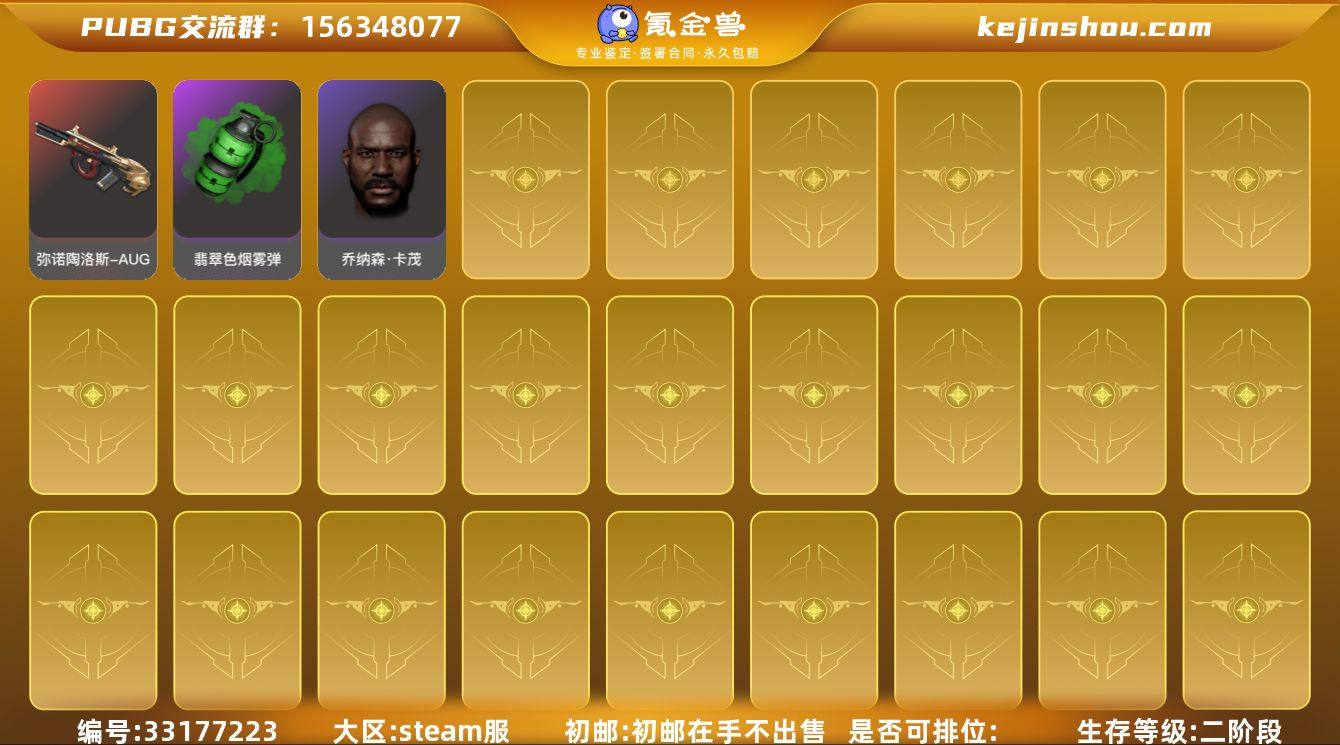账号来源: 自营 初邮情况: 初邮在手不出售 热门装扮: 金面具,渔夫帽 拥有成长型武器: 危险玩偶屋-SLR,刻耳柏洛斯-M249,美杜莎-Beryl M762