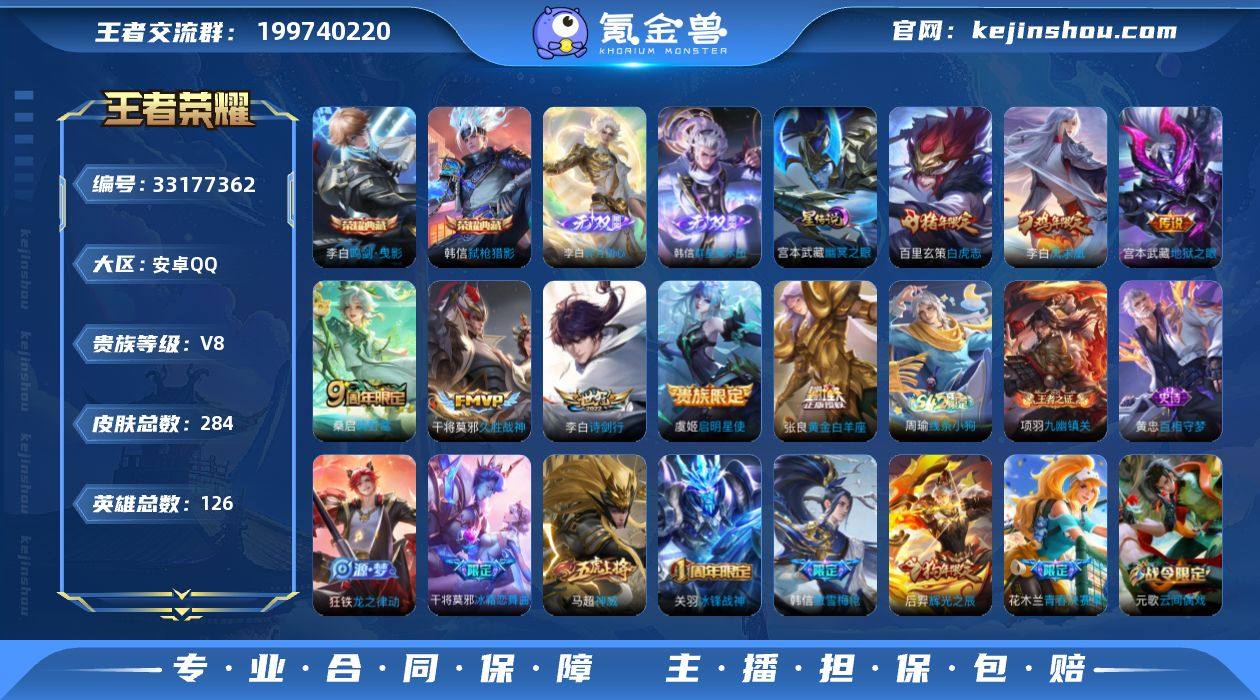 MCK632755 【李白无双典藏+韩信无双典藏!白虎志!诗剑行!】 皮肤数量284 印记总数17 【V8】 【荣耀王者】 【可修改】 账号类型1 无双2 荣耀典藏2 星元皮肤1 传说8 史诗77 账号类型:打野号; 无双:韩信_群星魔术团,李白_碎月剑心; 荣耀典藏:韩信_弑枪猎影,李白_鸣剑曳影; 星元皮肤:宫本武藏_幽冥之眼; 传说:宫本武藏_地狱之眼,张良_黄金白羊座,干将莫邪_久胜战神,桑启_鸣野蒿,虞姬_启明星使,李白_诗剑行,李白_凤求凰,百里玄策_白虎志; 史诗:嬴政_暗夜贵公子,小乔_青蛇,阿珂_节奏热浪,周瑜_线条小狗,梦奇_顽趣,项羽_九幽镇关,黄忠-百相守梦,蒙恬_荣光圣徽,牛魔_星界战将,狂铁_龙之律动,妲己_魅力维加斯,伽罗_箭羽风息,百里玄策_原初追逐者,沈梦溪_月团寄思,花木兰_水晶猎龙者,上官婉儿_梁祝,百里守约_特工魅影,李白_谪仙醉月,刘禅_天才门将,马超_神威,露娜_紫霞仙子,刘邦_德古拉伯爵,后羿_辉光之辰,赵云_未来纪元,程咬金_功夫厨神,蒙犽_百解令,不知火舞_魅语,夏侯惇_乘风破浪,张飞_乱世虎臣,阿古朵_江河有灵,赵云_引擎之心,刘禅_电玩爆裂旋风,貂蝉_圣诞恋歌,雅典娜_黎明之约,孙尚香_水果甜心,韩信_白龙吟,孙策_猫狗日...