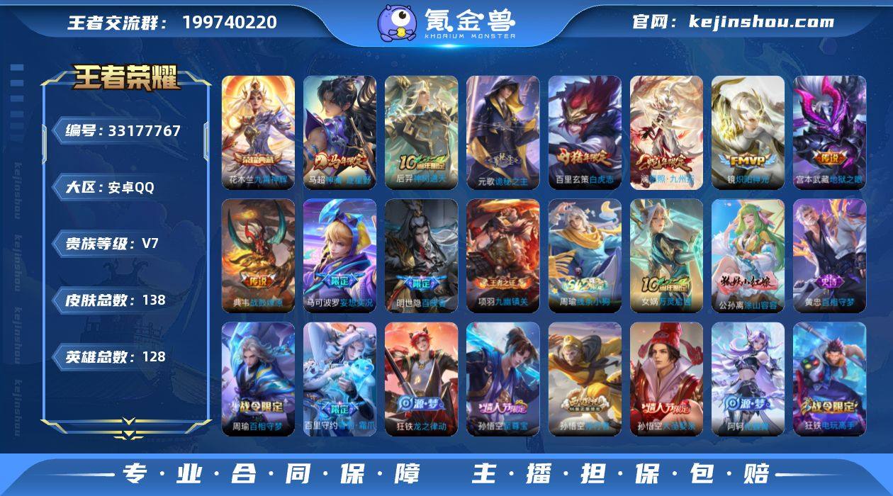 无二次安卓Q-V7-永恒钻石III段位-128英雄-138皮肤-1典藏皮肤-9传说-38史诗 【荣耀典藏】:花木兰九霄神辉 【传说皮肤】:马超神骥逐星野,后羿神树通天,元歌诡秘之主,澜愿照九州拓,典韦战鼓燎原,马可波罗妄想实况,镜炽阳神光,百里玄策白虎志,宫本武藏地狱之眼 【限定皮肤】:狄仁杰阴阳师,赵云皇家上将,高渐离玩趣恶龙,元歌无心,马可波罗妄想实况,狄仁杰魔术师,项羽海滩派对,王昭君午后时光,亚瑟潮玩骑士王,孙悟空至尊宝,孙悟空大圣娶亲,孙悟空孙行者,李元芳云中旅人,鬼谷子五谷丰年,百里玄策白虎志,百里玄策原初追逐者,沈梦溪大漠名商,裴擒虎擒涛扼浪,狂铁电玩高手,鲁班大师探海日志,桑启海盐诗旅,鬼谷子天穹祈灯 【年限皮肤】:百里玄策白虎志,澜愿照九州拓 【赛季限定】:沈梦溪大漠名商,李元芳云中旅人,桑启海盐诗旅,裴擒虎擒涛扼浪,鲁班大师探海日志,鬼谷子天穹祈灯,东皇太一噬灭天穹,太乙真人谧流熔炉,钟馗虚灵犬护,甄姬逆浪荇歌,亚瑟荣光之誓,百里玄策原初追逐者,项羽九幽镇关 【战令限定】:亚瑟潮玩骑士王,狂铁电玩高手,王昭君午后时光,孙膑茶境仙,马超访茗客,周瑜百相守梦,孙策百相守梦,周瑜线条小狗 【史诗皮肤】...