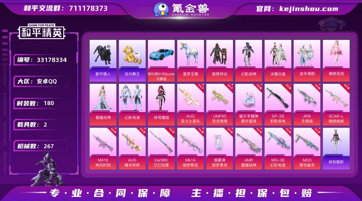 安卓 手Q-10粉装-16特效枪-2载具-5粉色飞行器-83369热力值-14王牌印记-180套装-267枪皮 【热门品类】:套装-浪漫天命,套装-都市猎人,套装-派对舞王,套装-龟仙人,套装-暗影哥特,角色-Mark.06 【粉色套装】:粉装-极限特训,粉装-幻影战神,粉装-冰霜白皇,粉装-金丰海韵,角色-樱桃泡泡,角色-智耀战神,粉装-幻彩电音,角色-绯穹魔姬,角色-鸢尾珑雾 【粉色枪皮等级】:SCAR-L-锦绣绵绵(五级),M416-电玩时刻(五级),AUG-暖羊咩咩(五级),AUG-圣斗士星矢(七级),ARX-无垠阁(五级),UMP45-恐龙拽拽(七级),Kar98K-巳巳如意(五级),Mk14-甜梦熊击(五级),Mk14-福马献瑞(五级),AMR-智耀战神(四级),AA12-G-萌骑幻想(四级),DP-28-豹影疾电(五级),MG3-辉羽雀灵(三级),MG-36-幻彩电音(四级),烟雾弹-甜梦果泡(五级),破片手榴弹-瓶中星球(六级) 【粉色载具】:保时捷918 Spyder(沉静蓝),星梦玉骢 【粉色枪皮】:SCAR-L-锦绣绵绵,M416-电玩时刻,AUG-暖羊咩咩,AUG-圣斗士星矢,ARX-无垠阁,UMP45-恐龙拽拽,Kar98K-巳巳如意,Mk14-甜梦熊击,Mk14-福马献瑞,AMR-智耀战神,AA12-G-萌骑幻想,DP-28-豹影疾电,MG3-辉羽雀灵,MG-36-幻彩电音,烟雾弹-甜梦果泡,破片手榴...