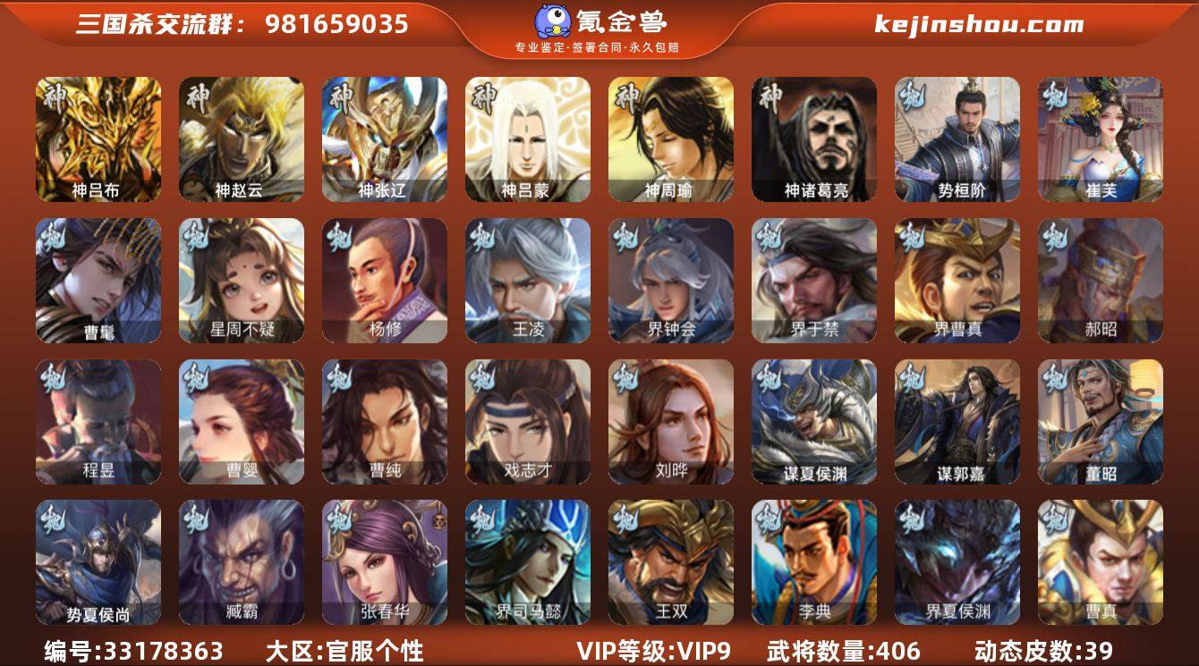 【14790054】官阶:大将军;VIP等级:VIP9;史诗武将数量:47;动态皮肤数量:39;武将总数:406;史诗宝珠数量:5;将魂数量:7888;神将:4;魏国史诗武将:20;蜀国史诗武将:8;吴国史诗武将:6;群史诗武将:16