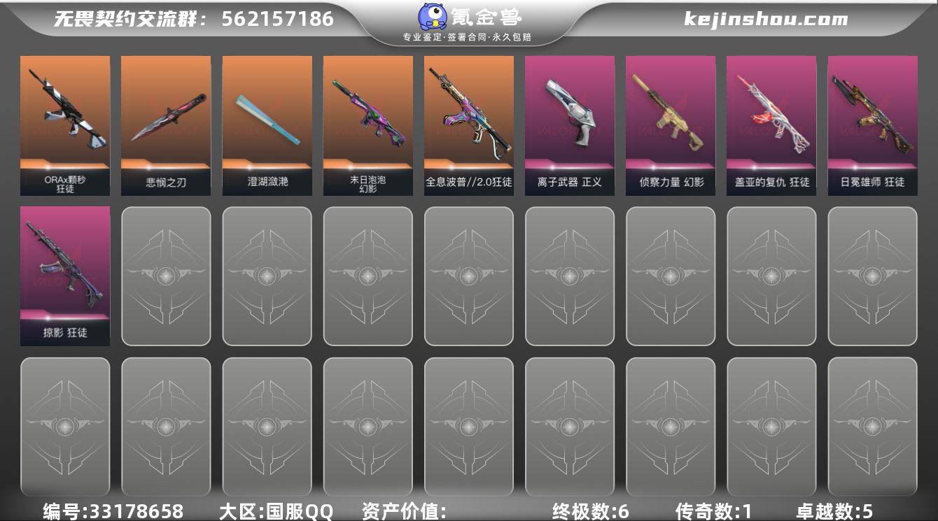 L3184 【性价比】波普狂徒 离子正义 狮子狂徒 掠夺狂徒 怜悯之刃 侦查幻影 颗秒狂徒 掠夺爪刀 泡泡幻影 澄湖潋滟 盖亚狂徒库存: 20160剩余VP:96剩余R点:40 段位:超凡历史最高:超凡