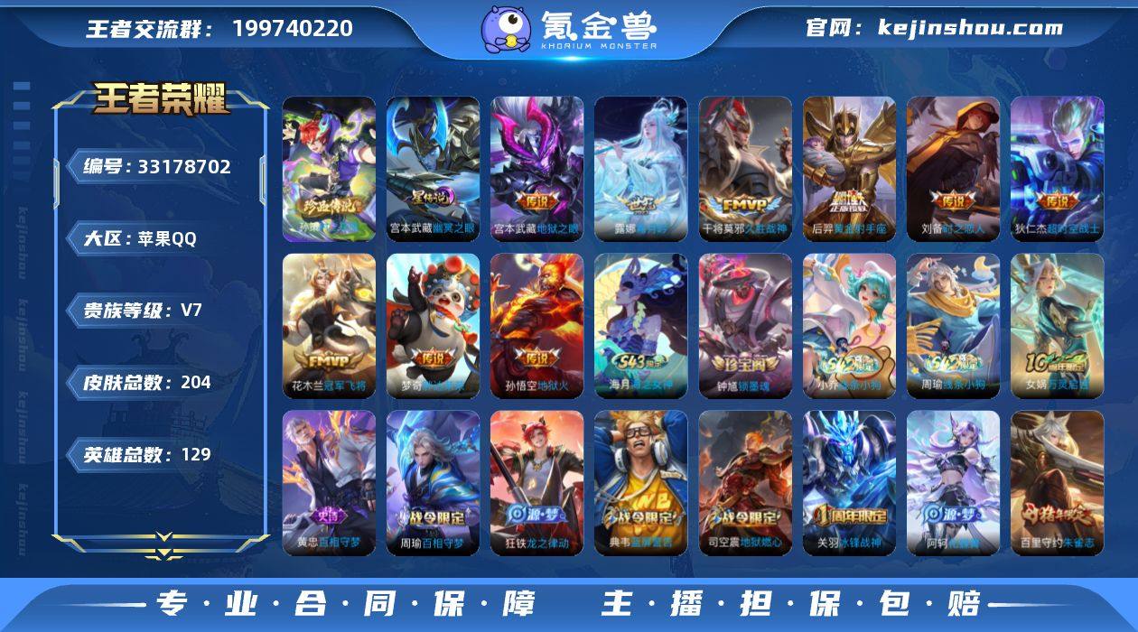 苹果Q-V7-永恒钻石II段位-129英雄-204皮肤-1珍品传说-9传说-50史诗 【英雄全皮】:孙权全皮,影全皮 【珍品传说】:孙策时之奇旅 【传说皮肤】:露娜霜月吟,刘备时之恋人,干将莫邪久胜战神,花木兰冠军飞将,梦奇胖达荣荣,后羿黄金射手座,宫本武藏地狱之眼,孙悟空地狱火,狄仁杰超时空战士 【限定皮肤】:姜子牙天穹之誓,狄仁杰阴阳师,赵云皇家上将,庄周高山流水,夏侯惇朔风刀,典韦蓝屏警告,狄仁杰魔术师,狄仁杰万华元夜,项羽海滩派对,老夫子醍醐杖,关羽冰锋战神,程咬金演武夺筹,露娜一生所爱,韩信飞衡,牛魔御旌,钟馗驱傩正仪,杨玉环遇见飞天,女娲朔望之晖,干将莫邪胡桃夹子,雅典娜单词大作战,鬼谷子原初探秘者,苏烈千军破阵,百里守约朱雀志,弈星混沌棋,明世隐疑决卦,裴擒虎李小龙,狂铁御狮,米莱狄御霄,云中君纤云弄巧,盾山御銮,上官婉儿梁祝,嫦娥拒霜思,蒙犽狂想玩偶喵,艾琳流音漫舞,司空震地狱燃心,阿古朵江河有灵,张良古海寻踪,蒙犽百解令,鬼谷子天穹祈灯,沈梦溪龙舞盛年,刘邦剑破天穹,刘备异域游侠,周瑜熔金海岸 【年限皮肤】:百里守约朱雀志,韩信飞衡 【赛季限定】:狂铁御狮,米莱狄御霄,牛魔御旌,盾山御銮,夏侯惇...