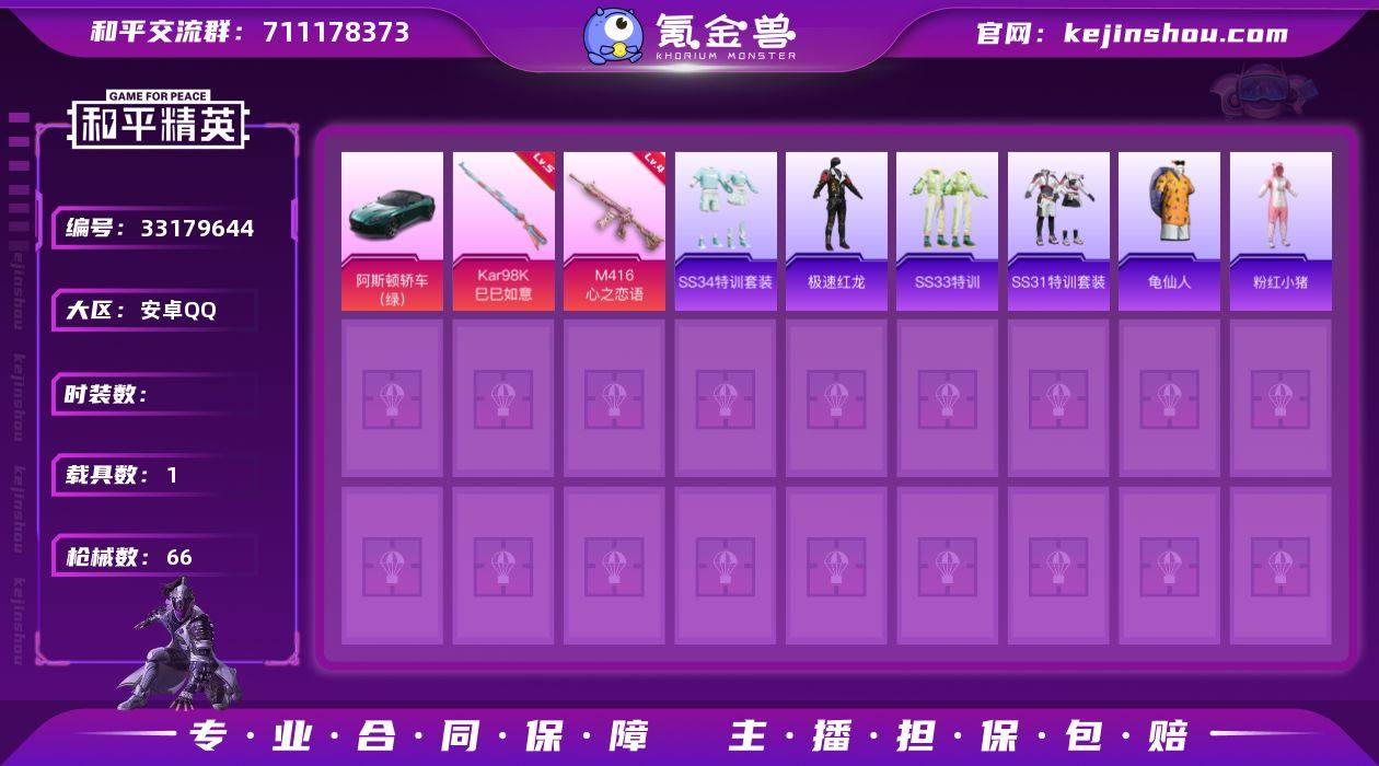 安卓Q 可二次 1载具3特效枪52套装66枪皮 阿斯顿马丁S绿色 M416-心之恋语(4级) Kar98K-巳巳如意(5级) AA12-G-萌骑幻想(4级) 马卡龙头盔 心之恋语背包 龟仙人 粉红小猪 极速红龙 和平精英账号