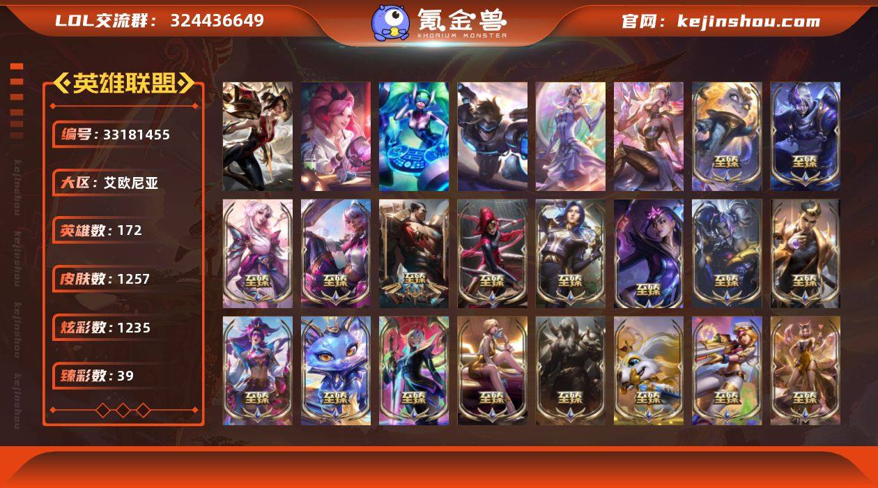 t39426 皇冠号【艾欧尼亚】1257皮肤 1235炫彩 39臻彩 86神话/194限定/114传说/172英雄 账号等级:2213【重要头像】爱情之歌 两仪无极 萨勒芬妮超级巨星 萨勒芬妮独立音乐人 我麦是开的么 击拳 KDA萨勒芬妮 星守金克丝炫彩 送披萨的小姐姐希维尔 美猴王孙悟空 不错哦 西部魔影卢锡安炫彩头 水晶圣骑艾希头 【重要皮肤】殿堂传奇卡莎 安魂曲娑娜至臻 永恒星灵佐伊至臻 暗裔英雄嘉文四世至臻 灵魂莲华劫至臻 灵魂莲华拉克丝至臻 战斗学院奇亚娜至臻 凯旋将军德莱厄斯至臻 黑色玫瑰假面舞会卡特琳娜至臻 双城之战2指挥官凯特琳至臻 暗星女王黛安娜至臻 魔域梦魇泽丽至臻 T1杰斯至臻 幻灵狮心蕾欧娜至臻 人工智能悠米至臻 至高天凯尔至臻 西部魔影伊芙琳至臻 天龙之子伊泽瑞尔至臻 神龙尊者比翼之龙洛至臻 北极星钢影卡蜜尔至臻 心之钢永恩至臻 魂蔷薇烈娜塔至臻 玉剑传说琴仙子至臻 斗魂觉醒派克至臻 DRX亚托克斯至臻 墨之影武者亚索至臻 花仙使者卡特琳娜至臻 青花瓷丽桑卓至臻 太空律动魔音海妖娜美至臻 海珀利安小队X09星环灵风迦娜至臻 星之守护者辛德拉至臻 星之守护者艾克至臻 海之歌萨勒芬妮至臻 西部魔影猎天使恶魔泰隆至...