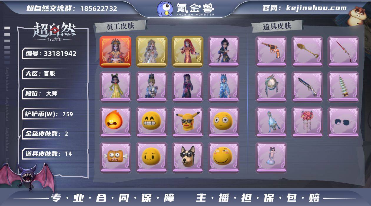 ZR192,红皮:1,金皮:2,紫皮:5,道具皮:14,外观:巫铃儿-镜生遗梦,薇薇安-圣光之谕,巫铃儿-镜花辞,阿念-王子与骑士,艾伦-水王子,爱丽丝-丝缕哀歌,逍遥-绣春逍影,小黄-呱呱雨衣,道具:短管猎枪-星光的裁决,传送按钮-昆仑镜,夜视仪-金丝眼镜,音响-happy猫,葫芦-伏妖塔,喷气背包-乘风溯雪,额外的背包-飞花令,转轮手枪-新星时代,黄牛能量饮料-青玉抱丹,桃木剑-凤鸣九天,铲子-龙鳞,背饰-天使的呼唤,员工:小黄,爱丽丝,零,逍遥,薇薇安,巫铃儿,艾伦,爱德华,动作:鹏友摇,舞台中心,律动迪斯科,举牌,抬手,KT猫摇,头饰:鱼头怪头套,烈焰红唇头套,火爆了头套,面具马头套,哈士奇头套,萨卡班甲鱼头套,嘻嘻头套,滑稽头套,呆滞头套,卑微头套,炙热烧烤,像素朋克墨镜,后室幸存者头套,挂饰:钗头凤,赛季魔盒:普通魔盒,累充:15180金砖,段位:大师,铲铲币:759w