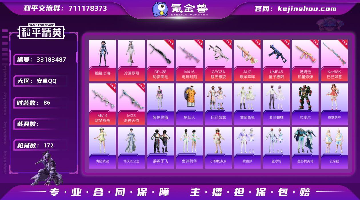 安卓 手Q-2粉装-12特效枪-0载具-2粉色飞行器-43475热力值-2王牌印记-86套装-172枪皮 【热门品类】:套装-龟仙人 【粉色套装】:角色-脆鲨七海,角色-冷漠罗丽 【粉色枪皮等级】:M416-电玩时刻(五级),GROZA-镜光银凌(五级),AUG-暖羊咩咩(五级),ACE32-萌骑漫游(四级),UMP45-量子极限(五级),汤姆逊-热量炸弹(五级),AKS-74U-森灵之息(四级),Kar98K-巳巳如意(五级),Mk14-甜梦熊击(五级),Mk14-福马献瑞(五级),DP-28-豹影疾电(五级),MG3-洛神天依(四级) 【粉色枪皮】:M416-电玩时刻,GROZA-镜光银凌,AUG-暖羊咩咩,ACE32-萌骑漫游,UMP45-量子极限,汤姆逊-热量炸弹,AKS-74U-森灵之息,Kar98K-巳巳如意,Mk14-甜梦熊击,Mk14-福马献瑞,DP-28-豹影疾电,MG3-洛神天依 【粉色飞行器】:炫彩糖果飞行器,英伦信使飞行器 【粉色降落伞】:洛神天依降落伞,精灵梦叶罗丽降落伞,未来领航者降落伞,绯果甜心降落伞,幻彩电音降落伞,时光之誓降落伞,绯穹魔姬降落伞,异瞳寒姬降落伞,炫彩糖果降落伞 【稀有套装】:套装-龟仙人,套装-巳巳如意,套装-雪国风尚,套装-炫彩糖果,套装-马上有钱,套装-雏菊兔兔,套装-萝兰蝴蝶,角色-拉斐尔,套装-糖糖葫芦,套装-青团波波,...