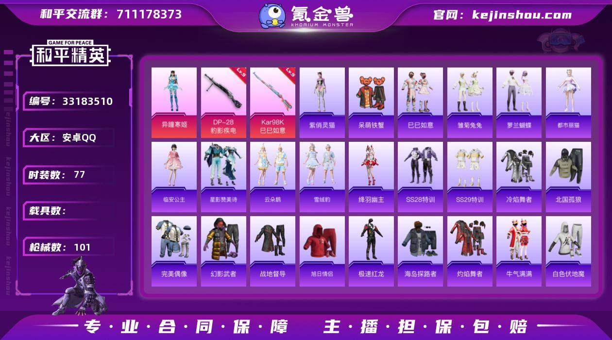 【精氪身法妹妹公主号·裙子特别多·2粉·3特·地铁满天赋·4粉飞行器】 安卓 手Q-2粉装-3特效枪-0载具-4粉色飞行器-31820热力值-6王牌印记-77套装-101枪皮 【粉色套装】:角色-异瞳寒姬,角色-六号石头人 【粉色枪皮等级】:Kar98K-巳巳如意(五级),Mk14-福马献瑞(五级),DP-28-豹影疾电(五级) 【粉色枪皮】:Kar98K-巳巳如意,Mk14-福马献瑞,DP-28-豹影疾电 【粉色飞行器】:炫彩糖果飞行器,繁龙极客飞行器,幻星舰长飞行器,时光之吻飞行器 【粉色降落伞】:千面幻镜降落伞,霓虹漫游降落伞,樱桃泡泡降落伞,星穹咏叹调降落伞,辉羽雀灵降落伞,冷漠罗丽降落伞,无垠阁降落伞,异瞳寒姬降落伞,炫彩糖果降落伞 【稀有套装】:套装-巳巳如意,套装-炫彩糖果,角色-罗莉,套装-马上来财,套装-雏菊兔兔,套装-萝兰蝴蝶,角色-都市丽猫,角色-临安公主,套装-星影赞美诗,套装-云朵鹅,套装-雪绒豹,角色-绛羽幽主,角色-紫俏灵猫,套装-粉彩缠枝,套装-雨过天青,套装-红釉青花,角色-孙斩天 【稀有枪皮】:AUG-冰晶雪宝,M416-蓝色火焰,AUG-月影灵韵,M762-云朵鹅,Vector-生命誓言,汤姆逊-像素花束,野牛-沙丘之主,SKS-迅猛狂鲨,Mini14-穿刺龙虾,AMR-镜光幻境,SVD-云朵...
