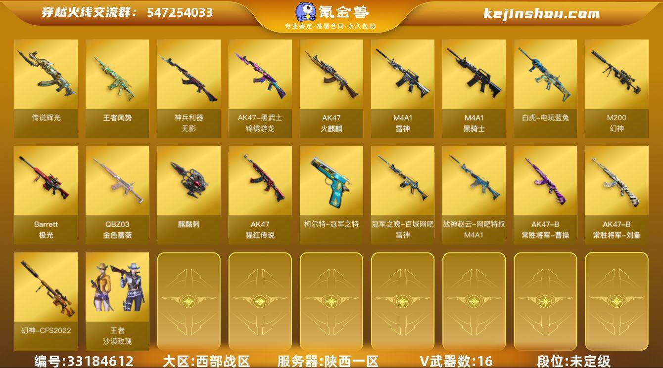 陕西一区-17V-2王者-1炫金 【传说武器】:传说辉光 【热门武器】:传说辉光,QBZ03-金色蔷薇,M200-幻神,白虎-电玩蓝兔,柯尔特-冠军之特,M4A1-黑骑士,斯泰尔-蝴蝶 【王者炫金武器】:王者风势,炫金武士 【皮肤】:幻神-CFS2022,雷神-冠军之魄,M4A1-战神赵云,死神-秘银,AK47-B-常胜将军-曹操,AK47-B-常胜将军-刘备*2 【角色】:王者沙漠玫瑰,暗夜-X,电竞少女,芳心审判者,嘉年华灵狐,娟娟,灵狐者-X,娜塔莉娅,潘多拉-甜心教官,斯沃特-X,兔囡囡,雪莉杨-摸金校尉,夜玫瑰-幻能朋克,影武者-X 【人偶武器】:斯泰尔-蝴蝶,COP-旗袍,生化手雷-机甲核心,迷你超能女侍 【挑战大师】:激光毁灭者III-白马银枪,VEPR-12-金魔 【英雄级武器】:AK47-火麒麟,M4A1-雷神,M4A1-黑骑士,无影-神兵利器,黑武士-锦绣游龙,QBZ03-金色蔷薇,AK-47-猩红传说,白虎-电玩蓝兔,Barrett-极光,M200-幻神,柯尔特-冠军之特,麒麟刺,闪光弹-雷霆王者-觉醒版 【道具】:EP战队炫彩背包,绿色巨人,灵魂忍者,变异宝贝,迷雾幽灵,夺命之镰,防化服*2,金色流光-枪王排位*2,星辰流光-枪王排位,枪王排位28赛季金色流光,电玩兔兔表情,防弹头盔*2,防弹衣*2,C4工具钳*2,手雷...