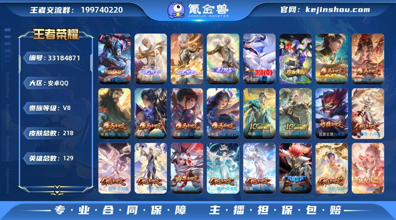 安卓Q-V8-永恒钻石I段位-129英雄-218皮肤-1典藏皮肤-3无双-2珍品传说-35传说-62史诗 【英雄全皮】:苍全皮,敖隐全皮,影全皮 【荣耀典藏】:吕布千魇归渊 【无双皮肤】:孙悟空无相,曜器灵螭龙剑,李白碎月剑心 【珍品传说】:孙策时之奇旅,马可波罗怪盗基德 【传说皮肤】:云缨神骥越千峰,关羽神骥镇沧海,朵莉亚神骥鸣幻洲,狄仁杰神骥赴朔漠,貂蝉神骥聚万邦,马超神骥逐星野,杨戬纵目迁山,后羿神树通天,西施续相思,后羿千劫归真,司空震愿照山河定,女娲愿照千秋盛,妲己愿照众生和,澜愿照九州拓,蔡文姬愿照福禄聚,虞姬愿照岁时盈,云缨幻光神枪,嬴政玄雷天君,桑启鸣野蒿,马超琥珀纪元,兰陵王影龙天霄,东皇太一灼幽烈阳,张飞百相守梦,马超无双飞将,王昭君乞巧织情,公孙离祈雪灵祝,虞姬启明星使,刘备时之恋人,张良黄金白羊座,干将莫邪久胜战神,达摩黄金狮子座,百里玄策白虎志,花木兰冠军飞将,孙尚香末日机甲,宫本武藏地狱之眼 【限定皮肤】:暃埋骨钱,姜子牙天穹之誓,狄仁杰阴阳师,赵云皇家上将,赵云龙胆,吕布御风骁将,马可波罗山海玄木吟,狄仁杰魔术师,达摩沙漠行僧,项羽海滩派对,韩信傲雪梅枪,兰陵王影龙天霄,兰陵王金庭之子,...