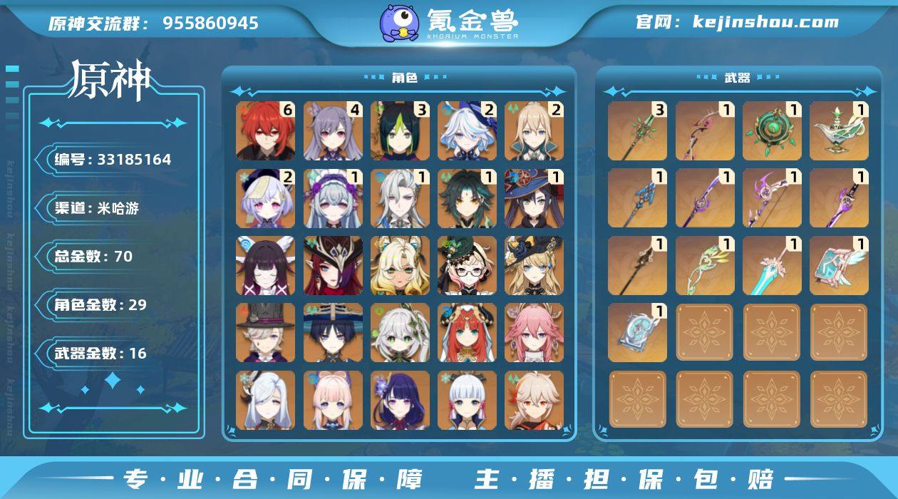 【AYY1065】60级/70黄/女主/29个五星角色/16个五星武器/艾梅莉埃/枫原万叶/娜维娅/流浪者/一命魈/温迪/二命琴/一命那维莱特/林尼/希诺宁/申鹤/神里绫华/八重神子/雷电将军/四命刻晴/纳西妲/三命提纳里/二命芙宁娜/妮露/珊瑚宫心海/一命莫娜/达达利亚/可莉/满命迪卢克/恰斯卡/二命七七/哥伦比娅/迪希雅/一命梦见月瑞希/最初的大魔术/猎人之径/飞雷之弦振/千夜浮梦/碧落之珑/四风原典/天空之卷/薙草之稻光/息灾/和璞鸢/贯虹之槊/雾切之回光/天空之傲