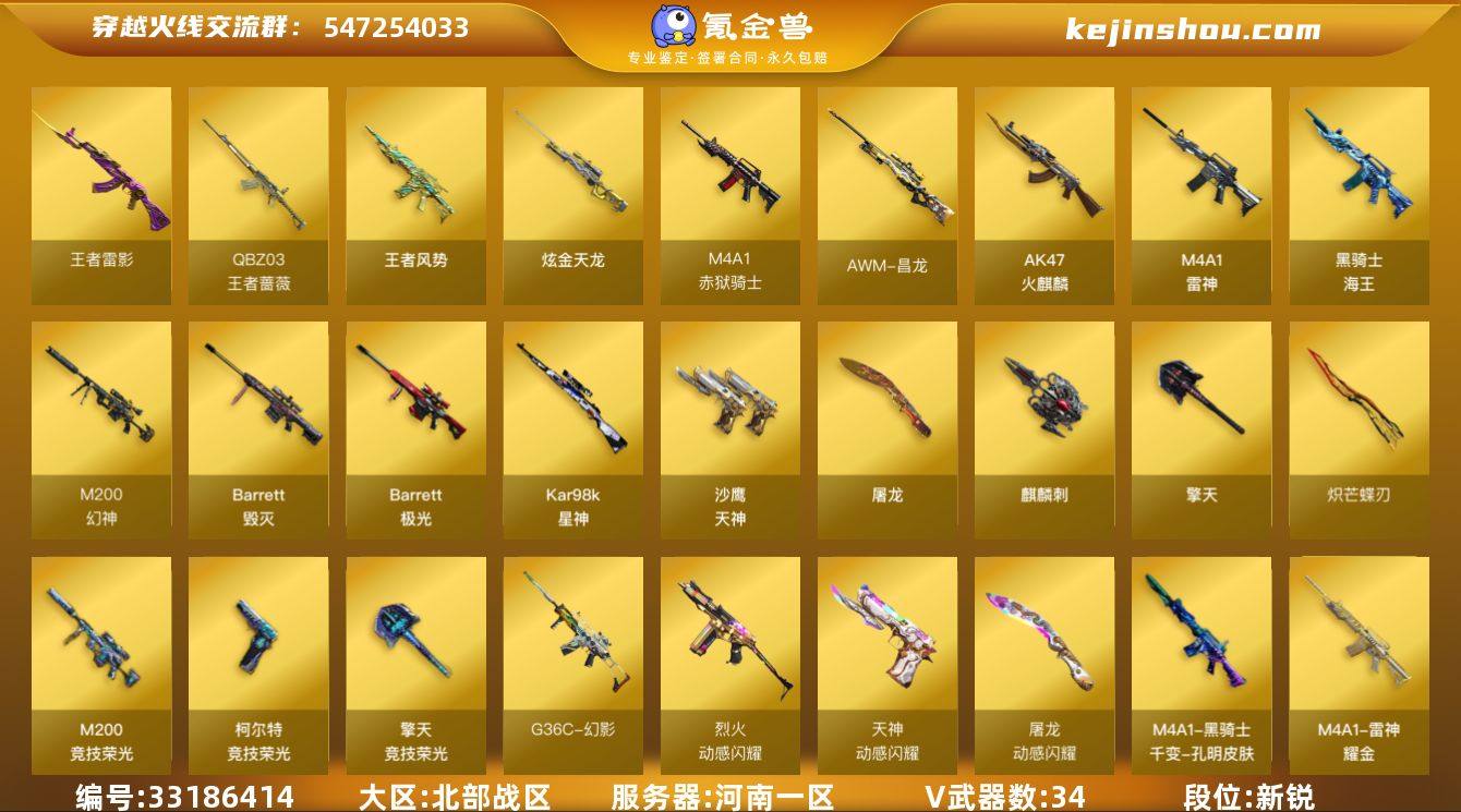 河南一区-40V-7王者武器数-1炫金武器数 【热门武器】:G36C-幻影,M200-幻神,QBZ-03-王者蔷薇,M200-竞技荣光*2,Kar98K-星神,C.A.T,羊驼玩偶,炽芒蝶刃 【王者炫金武器】:QBZ-03-王者蔷薇,王者风势,王者雷影,高爆手雷-雷霆王者,炫金天龙 【音效卡】:Kar98K-星神音效卡,M4A1-雷神音效卡,AWM-昌龙-怀旧音效卡,枪娘语音包-阿敏 【皮肤】:幻神-星耀 皮肤,幻神-电流骇客 皮肤*2,星神-枪娘默 皮肤,雷神-暗月,雷神-虎将,雷神-耀金皮肤,火麒麟-平天大圣,毁灭耀金皮肤*2,毁灭-黑大圣皮肤,毁灭-星耀 皮肤,M4A1-千变-孔明皮肤,M4A1-黑龙-361,AK47-黑武士-361,屠龙-星耀 皮肤,屠龙-破浪逐光 皮肤 【角色】:枪娘樱,星际战将,战地猎狐,王者炫,王者-魅影,王者云悠悠,蛇隐宗,奇洋探员,乔伊教练,云海玲珑,北极狐-X,芳心审判者,风暴女,虎妞,娟娟,兰-新年限定,灵狐者-X,蛇姬,雪莉杨 【人偶武器】:天龙-乔伊教练,加特林-机械猎手,C.A.T,迷你艾比 【英雄级武器】:AK47-火麒麟*2,M4A1-雷神,G36C-幻影,烈火-动感闪耀,黑骑士-海王,Barrett-毁灭*2,Barrett-极光*2,M200-幻神,Kar98K-星神,M200-竞技荣光*2,沙鹰-天神,柯尔特-竞技荣光,...
