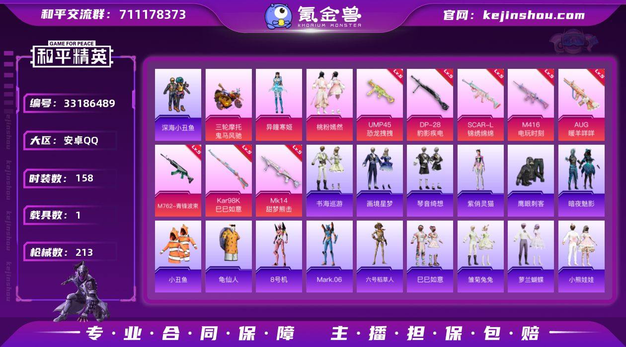 【特价出售/店主推荐】安卓 手Q-2粉装-10特效枪-1载具-1粉色飞行器-63157热力值-14王牌印记-158套装-213枪皮【热门品类】:套装-深海小丑鱼,套装-小丑鱼,套装-龟仙人,角色-8号机,角色-Mark.06,角色-六号稻草人【粉色套装】:粉装-桃粉嫣然,角色-异瞳寒姬【粉色枪皮等级】:SCAR-L-锦绣绵绵(五级),M416-电玩时刻(五级),AUG-暖羊咩咩(五级),M762-青锋波束(五级),UMP45-恐龙拽拽(六级),UMP45-萌骑冒险(二级),Kar98K-巳巳如意(五级),Mk14-甜梦熊击(五级),Mk14-福马献瑞(五级),DP-28-豹影疾电(五级)【粉色载具】:鬼马风驰【粉色枪皮】:SCAR-L-锦绣绵绵,M416-电玩时刻,AUG-暖羊咩咩,M762-青锋波束,UMP45-恐龙拽拽,UMP45-萌骑冒险,Kar98K-巳巳如意,Mk14-甜梦熊击,Mk14-福马献瑞,DP-28-豹影疾电【粉色飞行器】:炫彩糖果飞行器