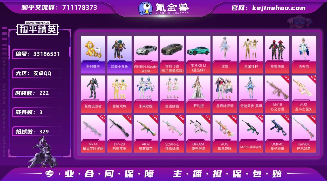 J3081 【精品女号】11粉 15特 3载 金鞋 深海小丑鱼 放客神游 洛天依 冰魄 未来歌姬 金属狂野 萨利娅 复仇流浪者 满级枪*15 地铁满天赋 收藏家等级80 安卓 手Q-11粉装-15特效枪-3载具-7粉色飞行器-101684热力值-16王牌印记-222套装-329枪皮 【热门品类】:套装-浪漫天命,套装-派对舞王,套装-深海小丑鱼,套装-龟仙人,角色-8号机,角色-Mark.06 【粉色套装】:粉装-金属狂野,粉装-放客神游,角色-洛天依,角色-复仇流浪者,粉装-垂柳戏鸭,粉装-未来歌姬,粉装-蜜语绒猫,角色-萨利娅,粉装-星穹咏叹调,角色-奇迹舞步 美琪,角色-冰魄 【粉色枪皮等级】:AKM-绿萝繁花(五级),SCAR-L-锦绣绵绵(五级),M416-心之恋语(七级),GROZA-镜光银凌(五级),AUG-暖羊咩咩(五级),AUG-圣斗士星矢(七级),M762-青锋波束(五级),UMP45-量子极限(五级),AKS-74U-森灵之息(五级),Kar98K-巳巳如意(五级),Mk14-精灵梦叶罗丽(七级),Mk14-甜梦熊击(五级),Mk14-福马献瑞(五级),AA12-G-萌骑幻想(四级),DP-28-豹影疾电(五级) 【粉色载具】:宾利飞驰(布罗德盖棕双色),宝马X6 M(曼岛绿),保时捷918 Spyder(液态银) 【粉色枪皮】:AKM-绿萝繁花,SCAR-L-锦绣绵绵,M416-心之恋语,GROZ...