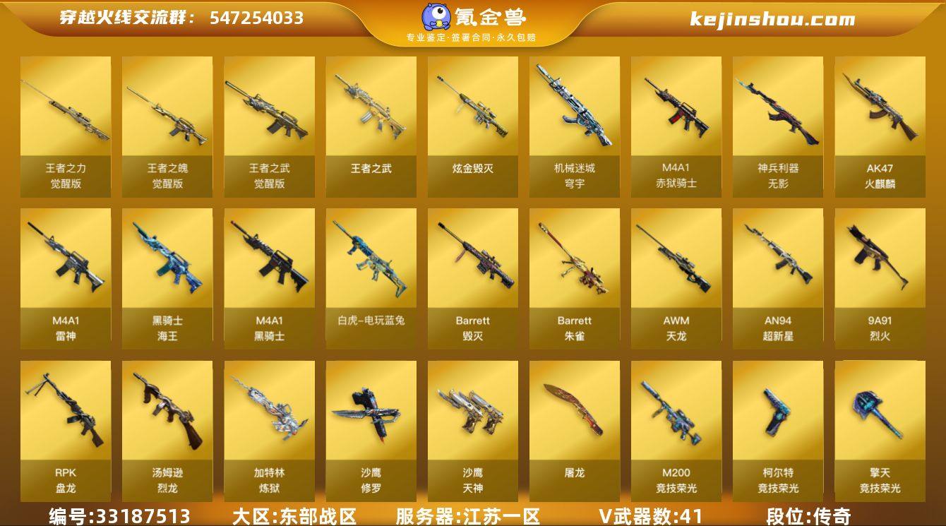 江苏一区-51V-4王者武器数-1炫金武器数 【热门武器】:M200-竞技荣光,死亡之眼,白虎-电玩蓝兔,M4A1-黑骑士*2,汤姆逊-烈龙*6,RPK-盘龙,加特林-炼狱*2,沙鹰-修罗*3 【王者炫金武器】:王者之武,炫金毁灭 【音效卡】:屠龙-电竞之星-竞星跃动音效卡,M4A1-雷神音效卡,Barrett-毁灭音效卡,HK417-朱雀-电竞之星-竞星跃动音效卡 【皮肤】:雷神-暗月,雷神-蓝风铃 皮肤,火麒麟-心动糖果,毁灭-航天科技皮肤,毁灭-英雄计划 皮肤,黑龙-能量核心,HK417-朱雀-掌火灵橙 皮肤,天龙-能量核心,极光-掌火灵耀 皮肤,天神-暗月 【角色】:零·纪元,不败狙神,修道士,幻面灵狐,斗烈龙骑,初恋灵狐,芳心审判者,飞虎队-X,风暴女,嘉年华灵狐,娟娟,兰-新年限定,潘多拉-X,潘多拉-甜心教官,潜龙队-X,邱刚敖,斯沃特-X,蜀雪,兔囡囡,新娜塔莎,团团 【人偶武器】:AWM-灵狐-15周年嘉年华,迷你深渊冰龙*2,迷你牛魔王,迷你牛牛,迷你生化手雷,深渊终结者手雷*2,灵狐娃娃手雷 【暴走生化】:死亡之眼,超级对讲机 【挑战大师】:AK47-冰龙粉碎者*2,冰龙粉碎者-白马银枪,激光毁灭者III-白马银枪,神圣爆裂者-末日III*2 【英雄级武器】:AK47-火麒麟*2,M4A1-雷神,M4...