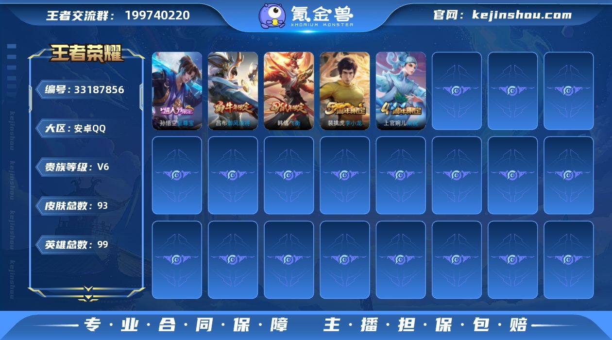 安卓Q 可二次 1传说99英雄93皮肤 神骥越千峰 至尊宝 御风骁将 飞衡 星空之诺 银河之约 死神来了 梁祝 原初探秘者 李小龙 暗隐猎兽者 千年之狐 赤莲之焰 狰 饕餮 穷奇 御霄 御銮 朔风刀 混沌棋 疑决卦 醍醐杖 万华元夜 演武夺筹 驱傩正仪 霸王丸 大漠名商 云中旅人 皇家上将 魅力维加斯 鹰眼统帅 魔术师 王者荣耀账号